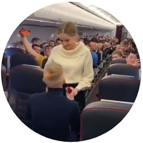 Что может быть романтичнее предложения на высоте сотен тысяч метров от Земли? В январе 2020-го калининградец Вячеслав Макогонов попросил руки у своей девушки Алины Загировой на борту самолёта, летевшего из Москвы. Девушка, недолго думая, ответила «Да!» и расплакалась, а пассажиры стали аплодировать новоиспечённым молодоженам. Как выяснилось позднее, пара работала на стойке регистрации в «Храброво».