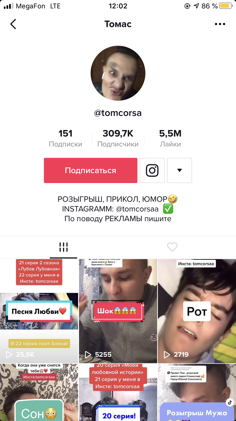 Сейчас у @tomcorsa 309,7 тысячи подписчиков в TikTok12+ и рекламный контракт с компанией Dirol