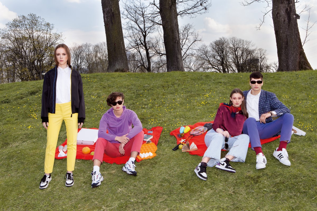 На праздничном пикнике нужно выглядеть ярко. Брюки чинос насыщенных цветов подойдут для вашего опен-эйра как нельзя кстати. И можно забыть про женскую монополию на розовый и лиловый: самовыражение доступно каждому. Теперь на смену массивным тракторным подошвам и ugly-shoes** приходят кроссовки классической формы.
