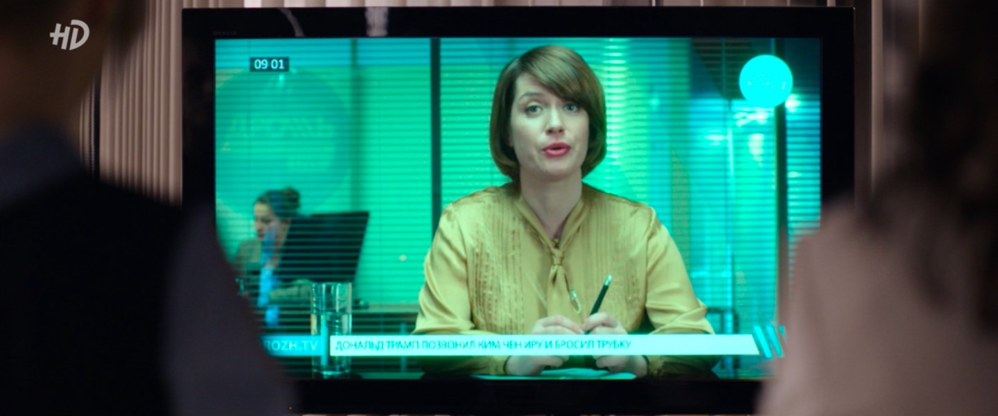 Елена Ванина в роли телеведущей телеканала «Дрожь». Кадр из сериала «Последний министр»