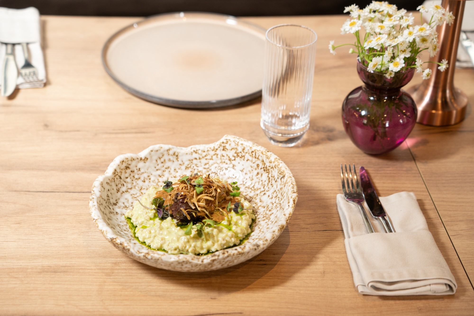 Томас: К примеру, салат со скумбрией в квасном сусле. Рыба маринуется, потом покрывается квасным суслом и обжигается горелкой. К ней добавляются листья салата, томат, жареный картофель и всё это заправляется домашним майонезом на основе тыквы, который мы делаем сами. Второе блюдо — говяжьи щёки, в Балтийских их никто не ел. Когда гости начали пробовать, оказались в восторге. Решили пойти на эксперимент, и в качестве гарнира выбрали перловку. Мне сначала говорили: «Да ну, прекращайте, тут одни солдаты, какая перловка». Но при дегустации никто даже не понимает, что это, потому что она приготовлена как ризотто. Получается перлотто с говяжьими щеками. Эти два блюда у нас вне конкуренции, их очень любят. Ну и плюс пицца и паста.