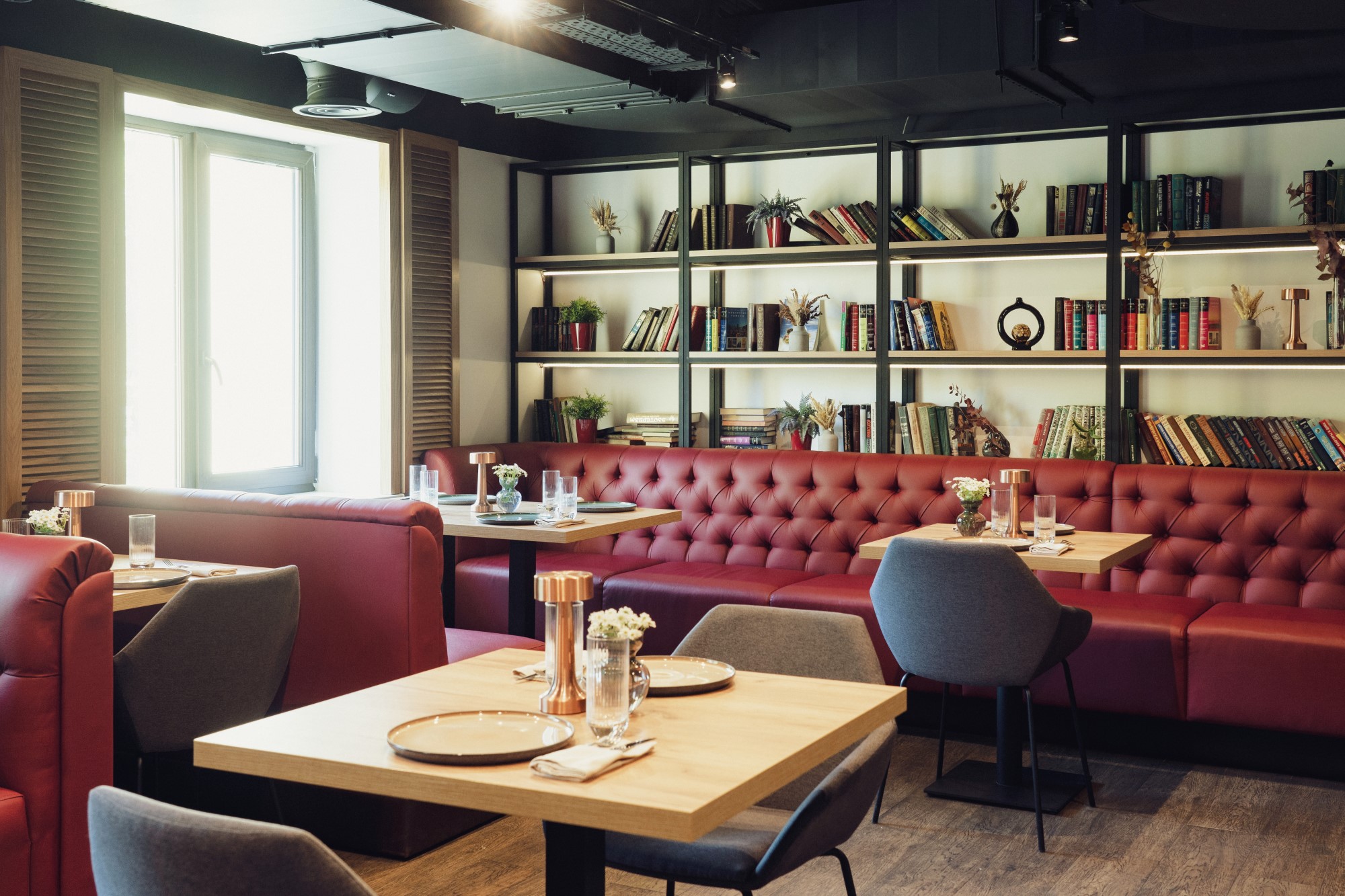 Татьяна: Всё пространство ресторана разделено на две зоны. Большой зал с уютной барной зоной и камерный зал «Библиотека». В последнем можно проводить бизнес-мероприятия, семинары, рабочие обсуждения и, конечно, банкеты, есть возможность изолировать эту зону от основного зала.