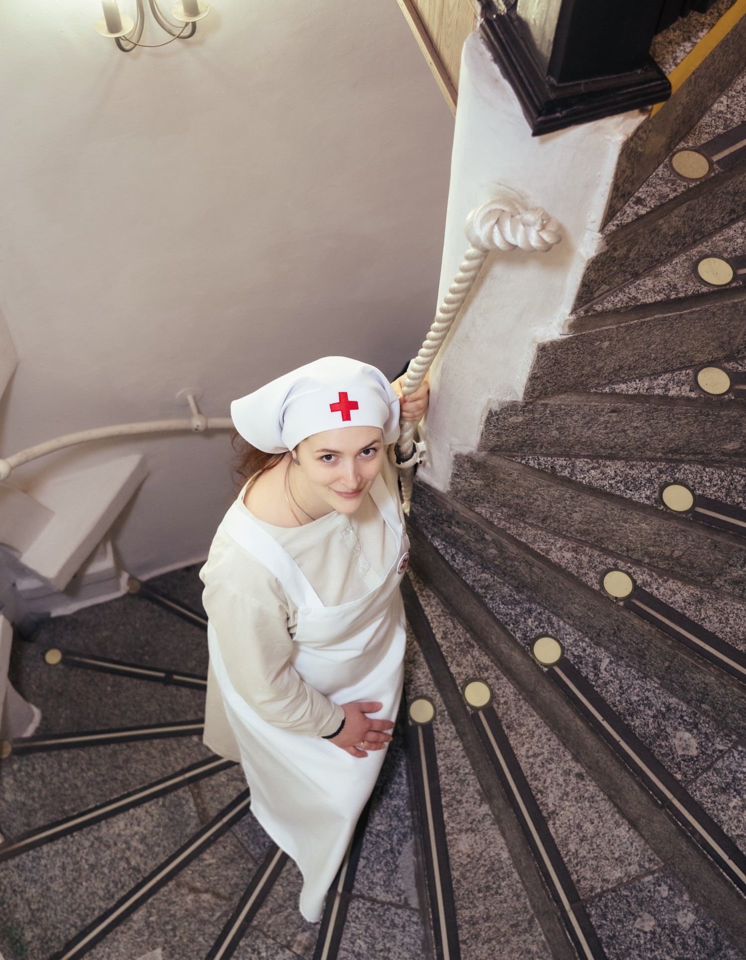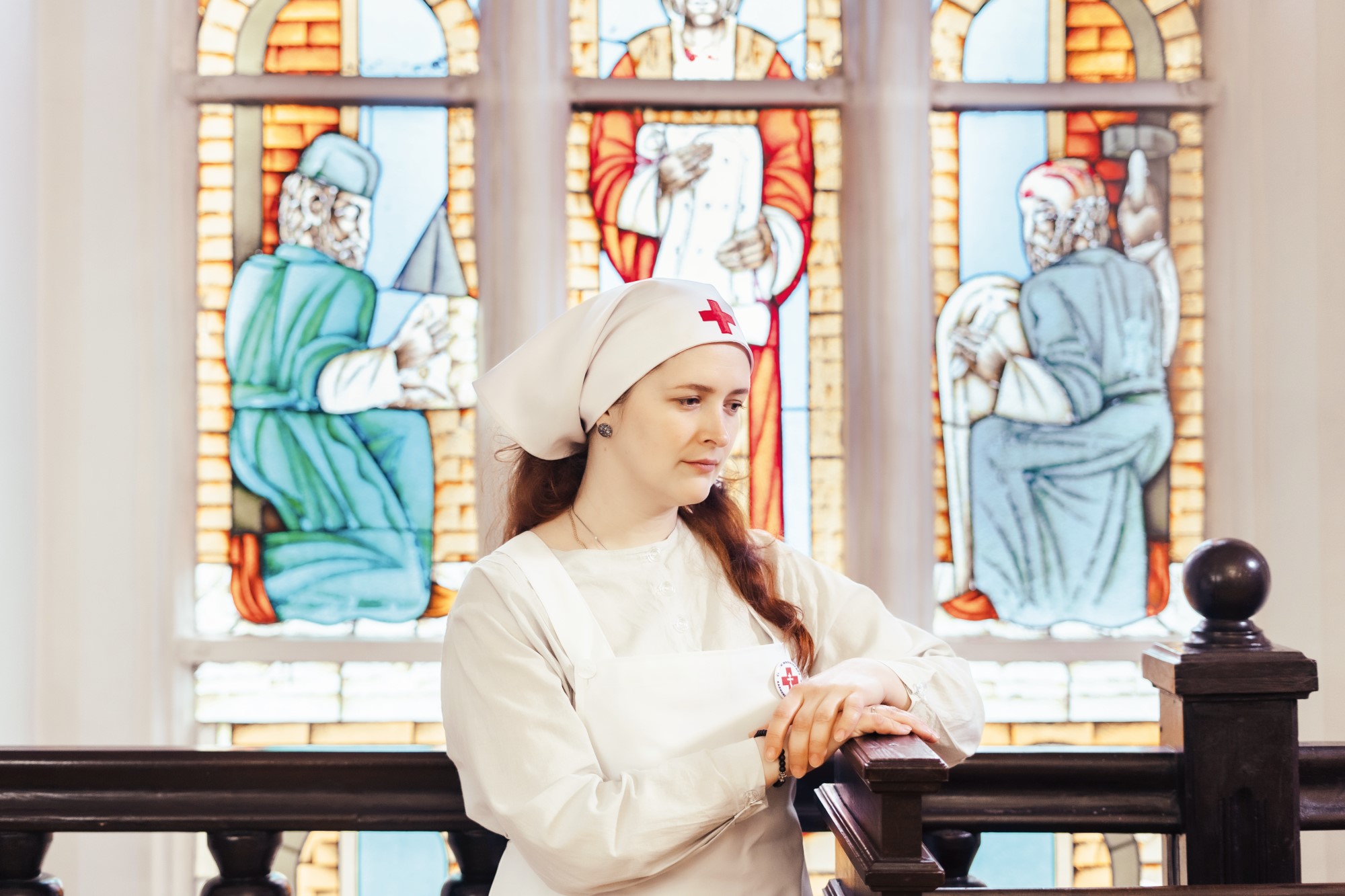Мария Ильина поёт в фольклорном ансамбле, преподаёт в музыкальном колледже, а ещё раз в неделю работает сестрой милосердия. На ней светлое облачение, белый фартук и головной убор с красным медицинским крестом. Заниматься сестринской помощью решила два года назад, когда узнала, что в Калининграде открыли набор. Подготовка проходила в БФУ им. Канта. Будущих сестёр обучали первой медицинской помощи, гигиене, отдельные лекции читали священники.