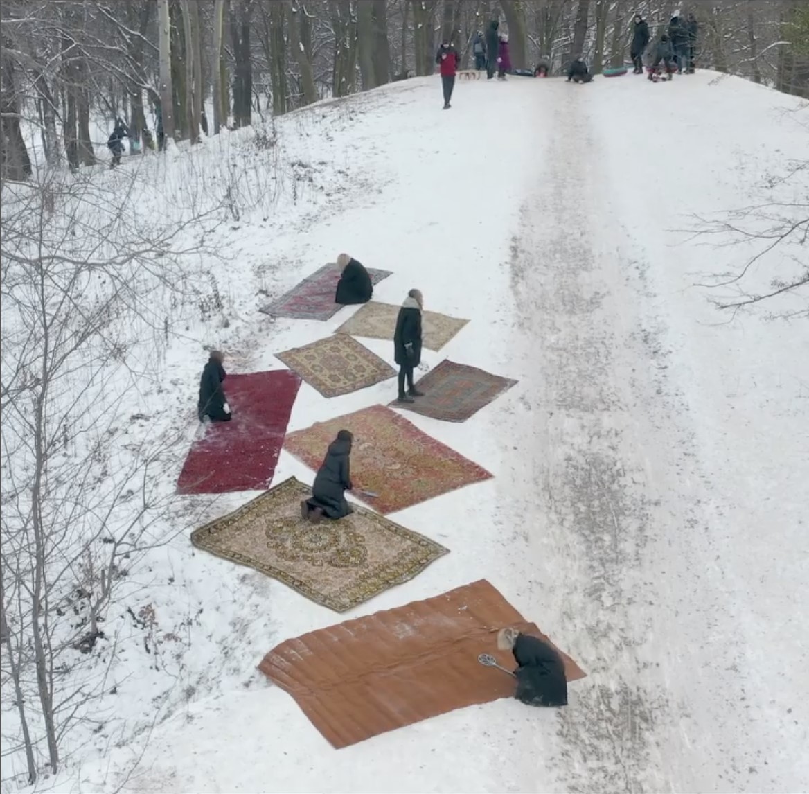 Одна из последних работ арт-группы — «Женщины, выбивающие ковры». Это часть видео-триптиха: в первой его части девушка снимает ковёр со стены и он падает на неё, во второй она скатывает ковёр, лежащий на полу, а в третьей сразу несколько женщин выбивают ковры на снегу. Работа родилась из личного переживания Жени и посвящена памяти. Ковёр как метафора впитывает не только пыль, но и аккумулирует звуки, воспоминания — всё, что происходило в квартире. Это очень понятный символ, потому что ковры до сих пор есть почти в каждой квартире.