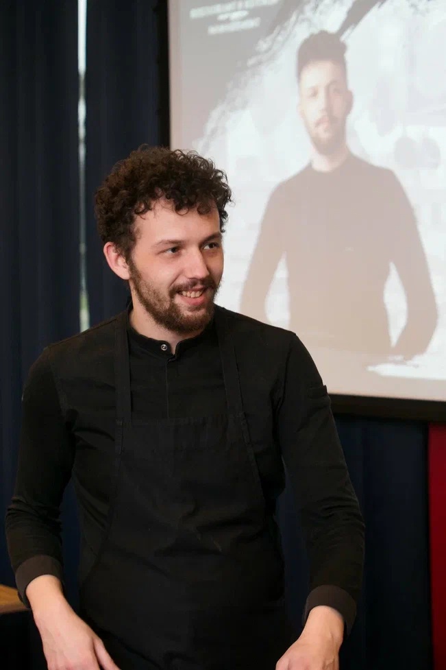 Следующим лекцию провёл шеф-повар лучшего ресторана Сибири по версии WhereToEat-2021 и 2022 Александр Кучеров. Он рассказал об арт-плейтинге — искусстве размещения элементов блюда на тарелке. Эта техника используются в основном в высокой кухне для создания красивой презентации блюд, и сам Александр использует её в 075 please. Он затронул такие аспекты, как композиция, колористика и посуда. Всё это важно в том числе и для маркетинга еды: повышая узнаваемость своих блюд, шеф-повар работает на бренд.
