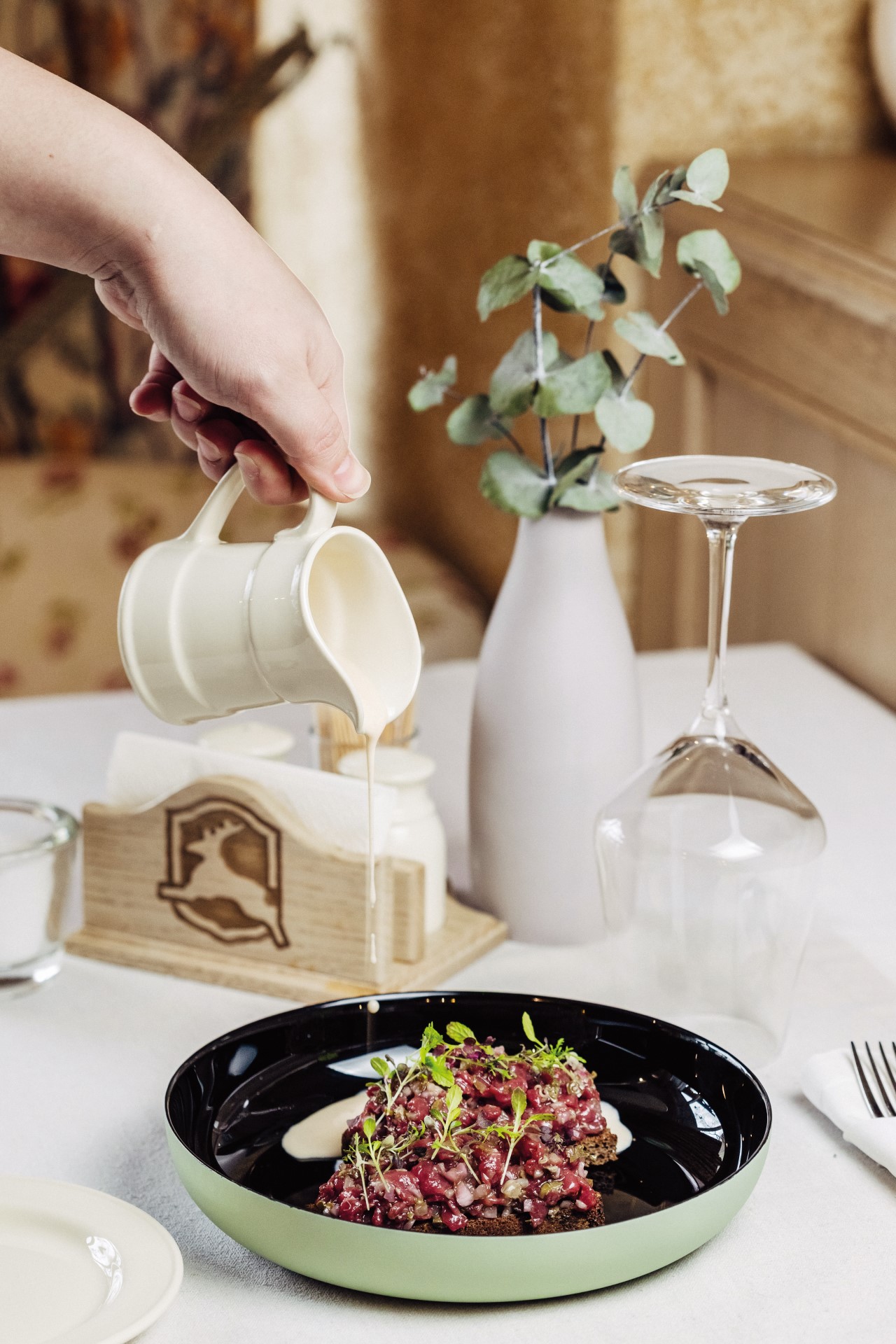 Александр: У нас достаточно интересный тартар из оленя. Мы немного изменили классический рецепт — сейчас он подаётся с соусом из молодых сыров.