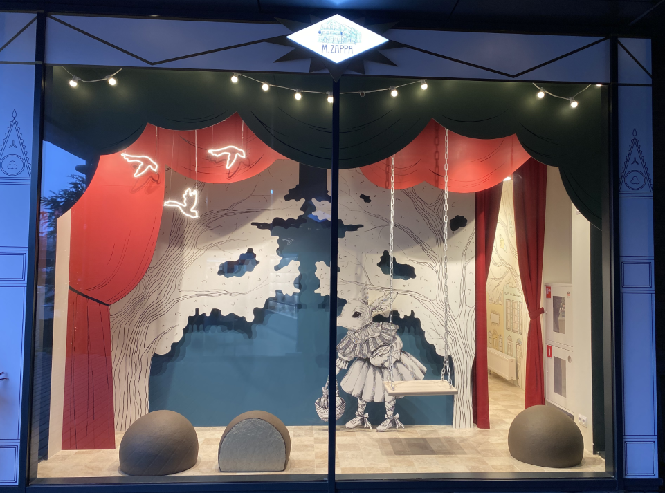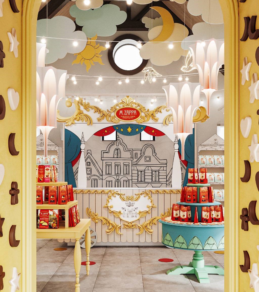 Уникальный дизайн магазинов Zappa создан командой калининградских художников. У входа гостей встречает оленёнок Луиза, а само пространство напоминает театральную сцену, украшенную фантазийными декорациями, которые переносят гостей в мир сказочных сюжетов. Яркие цвета, уютные уголки и волшебные персонажи создают неповторимую атмосферу, и выбор сладостей становится настоящим праздником.