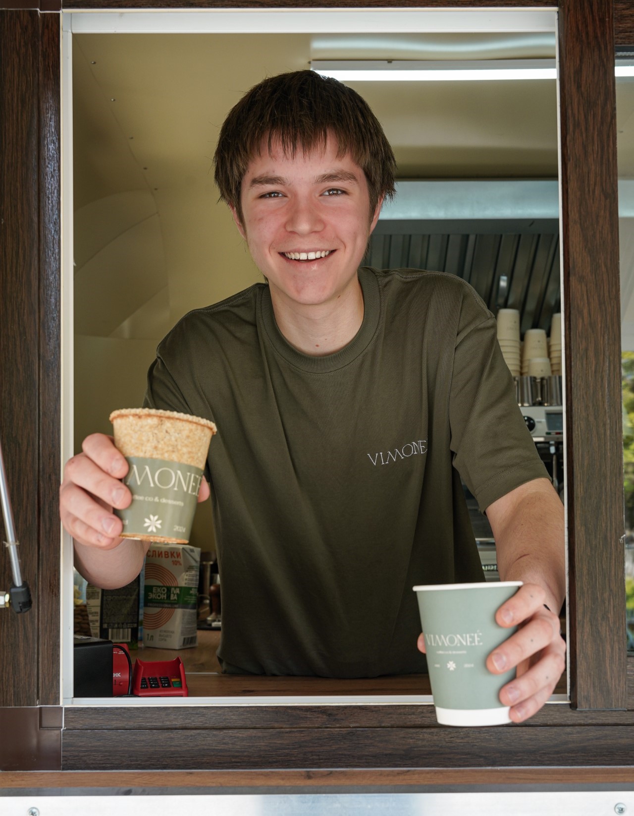 Для подачи кофе мы делаем акцент именно на съедобные стаканчики, а не на привычные бумажные — это экологично. Конечно, оставляем выбор за гостем, но именно Vimoneè — первая кофейня в Калининграде, где появились стаканчики, которые можно съесть.