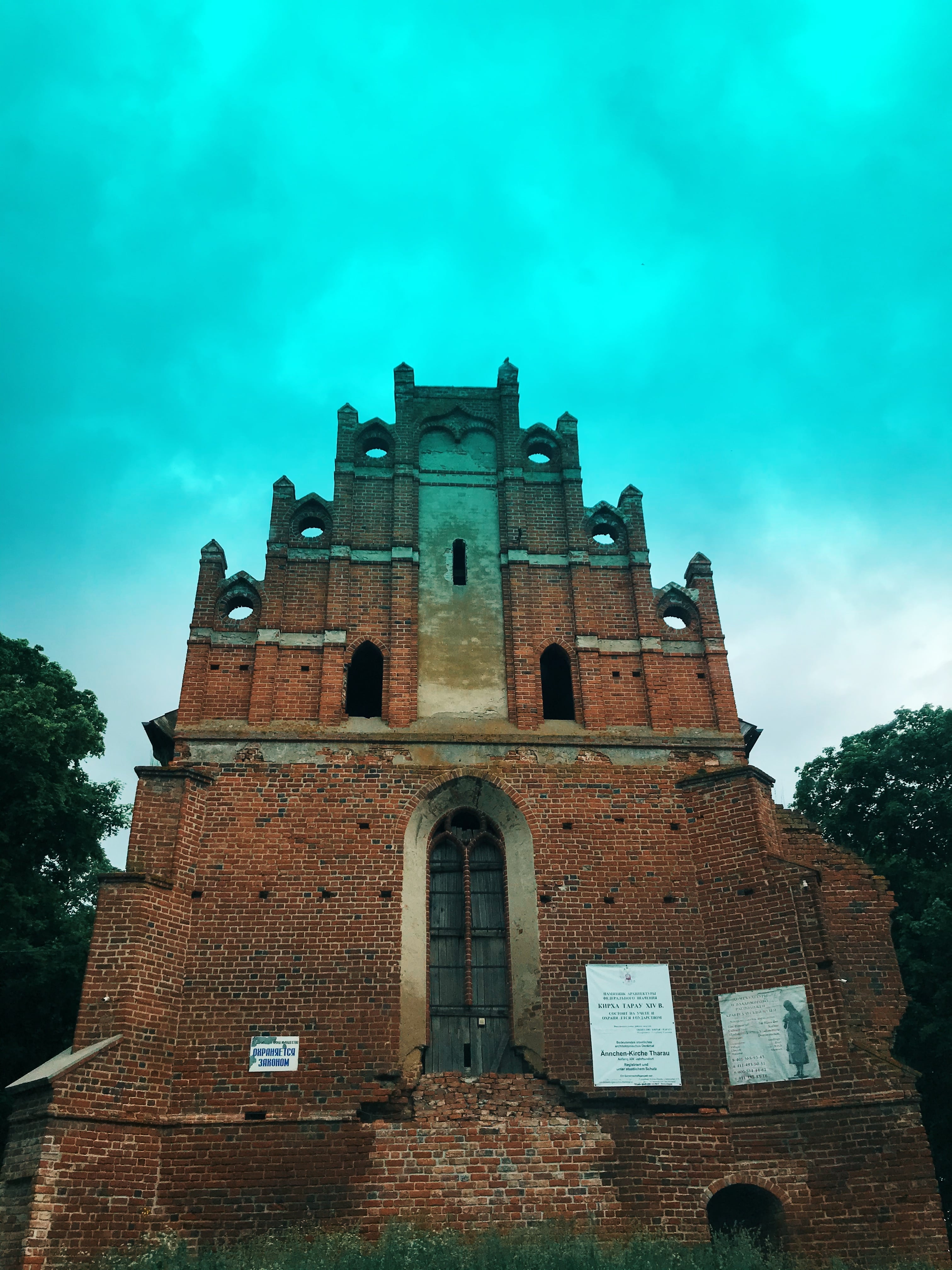 Датой строительства кирхи считается 1315 год. Только вдумайтесь в эти цифры! У вас есть прекрасная возможность прикоснуться к стенам, которым 705 лет. Доступ к кирхе свободный. Конечно, сейчас от неё остались лишь руины, но, если представить почтенный возраст, сразу проникаешься к ним уважением. До нас дошли лишь башня без перекрытий и шпиля да фрагменты стен. Когда-то эта самая башня была городской надвратной, дополненной восьмиугольной в сечении надстройкой. Сейчас сквозь кирпичный «колодец» видно небо. Кирха постепенно зарастает деревьями. Рядом с руинами стоит домик пастора с резной крышей.