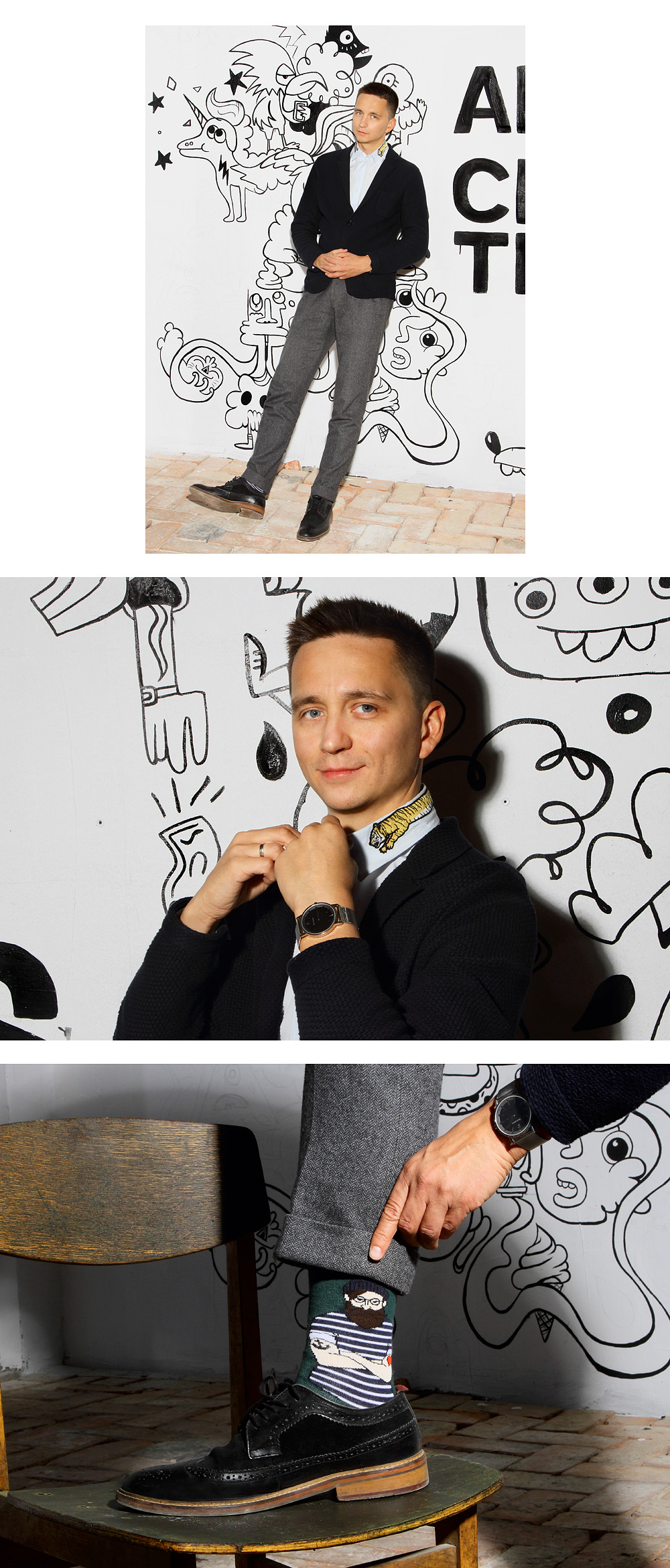 Я обожаю необычные запонки и галстуки. Еще очень люблю бабочки, но сейчас редко выдается повод их надеть, так как это вечерний аксессуар. Раньше я часто играл как диджей, у меня был ночной образ жизни, и я часто их носил. Еще очень люблю цветные носки. Даже к офисным костюмам такие подбираю - если беру спокойных оттенков, то обязательно в полоску или с рисунком. Мне еще нравится марка Ermenegildo Zegna - я ее пока не носил, мне кажется, я для нее еще слишком молод, но в будущем вижу себя в таком стиле.