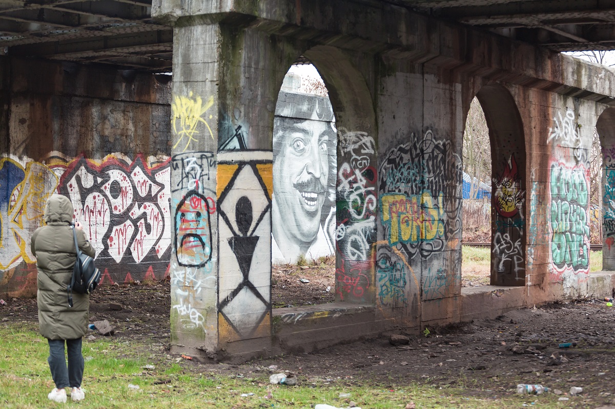 Гуляем дальше по парку Калинина и доходим до Детской областной больницы. Минуем парковку больницы, и на пути встают огромные арки, на которых нет живого места: всё разрисовано в несколько слоёв. Очень колоритно. После арок проходим дальше по тропинке и обращаем внимание на речушку и микрообъект под названием «Брехня». Очень цепляет внимание, как и все работы @dsharkart. Дальше на пути — интереснейший спот у железнодорожных путей: стихийный холл-оф-фейм (зал славы. — Ред.) — полулегальное место, где райтеры оттачивают своё мастерство, получается своеобразный музей под открытым небом. Райтеров оттуда не гоняют. Место живёт и обновляется: старые граффити закрашиваются новыми, поэтому расписывать подробности не имеет смысла. Здесь представлены работы художников @0331c, @mrook.mroox и тот самый Боярский @maxnavigator, появившийся весной во время пандемии. Маршрут закольцован. Быстро добраться до отправной точки можно по нефункционирующим железнодорожным путям. Ориентир — Art Cluster.