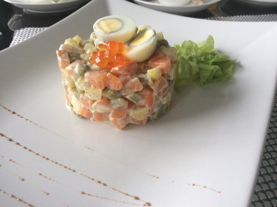 Датский салат — шикарный рыбный вариант оливье, приготовленный жителями родины Андерсена. Стейк из акулы c диким рисом в виде гарнира. Белый чай Лао Бай Ча Бан сулил мне красоту и молодость!