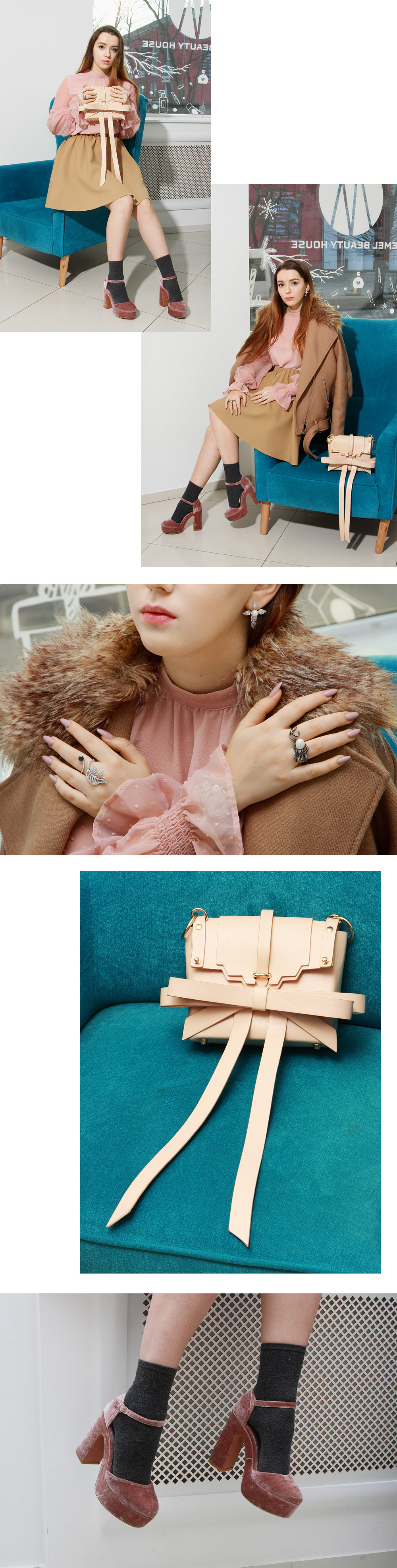 Образ - кукольная ваниль, очень органичный для меня. Сумка куплена на Ebay в золотые времена, довольно дорогая для меня вещь. Она трансформер – у неё меняется бант, меняется ремешок, она прекрасного пудрового цвета. Она неудобно закрывается, но любимица. Хранится в чехле, чехол в коробке, перекрещиваю её каждый раз, как убираю, чтобы ничего на неё не упало, не сломало и не поцарапало. Серьги–кресты с жемчугом – это мои любимчики, обожаю кресты, обожаю жемчуг, и тут всё сошлось. Заказывала на продажу, но не смогла с ними расстаться и оставила. Юбку заказала в интернете, а блузку и туфли купила здесь. Вынесла прямо несколько вещей из одного магазина, а это мне не свойственно. Но главное, что всё носится с удовольствием.