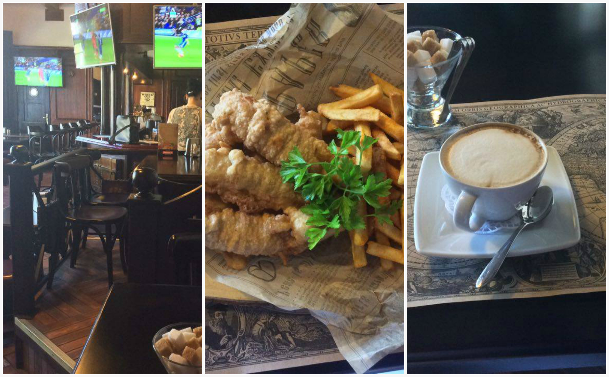 Также сомнительно было присутствие обещанных баварских колбасок - уж больно они смахивали на жареные, хоть и не дешёвые сосиски. Подавая мне, на газетной бумаге вместо тарелки (оригинально, черт возьми) следующее за салатом блюдо, многообещающий «Фиш & чипс», молодой человек с миной огромного разочарования заметил, что, конечно же, его употребляют не с кофе, намекая на кружку пенного, в количестве сортов которого, де, его заведение преуспело. Но не успел я высказать согласие с ним по этому поводу, как, попробовав принесенное яство, был несказанно удивлен. Первая часть названия гарантировала рыбу, тогда как в нем проявлялось на вкус будто бы куриное филе в кляре! Причём «чипс» в виде картошки фри всё же имелось. Так вот почему хитрец отговорил меня от куриного хвороста: масло оказалось бы масляным. Впрочем, будучи приученным нашим общепитом к подобным фортелям, я подумал, что ничего в этом страшного нет.
