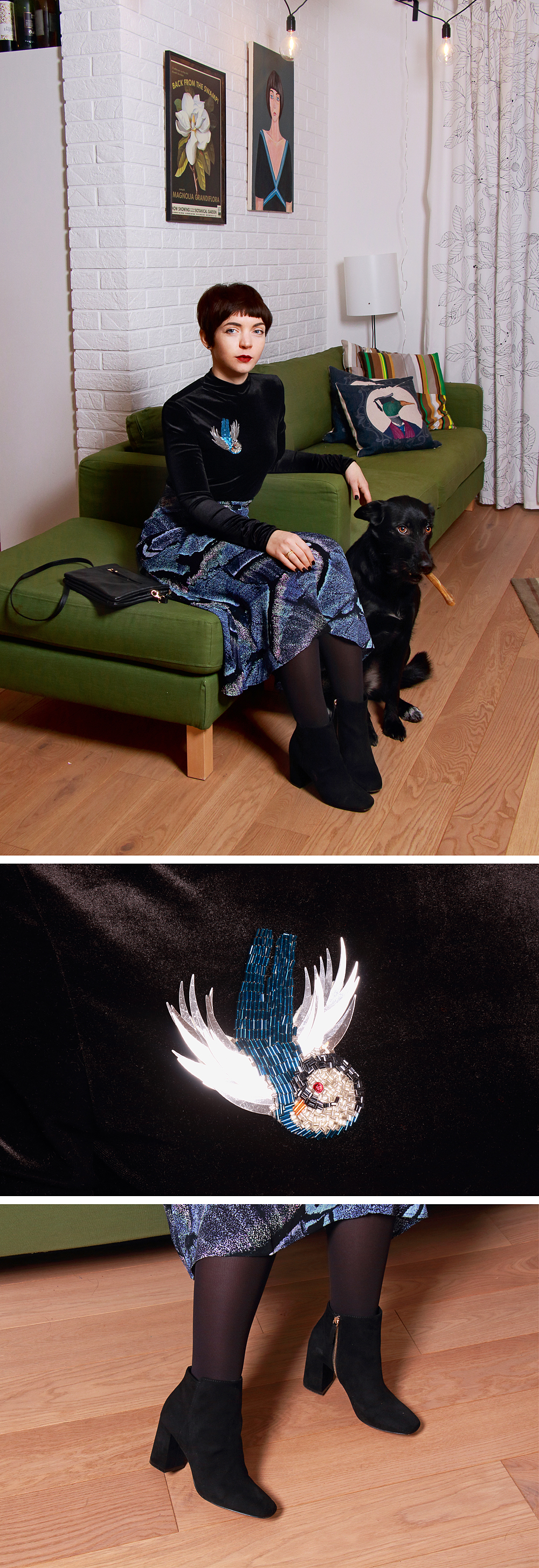 Что надеваем: Бархатный боди из берлинского магазина распродаж, юбка &Other Stories, брошь Lovebloodrhetoric, ботильоны Stradivarius