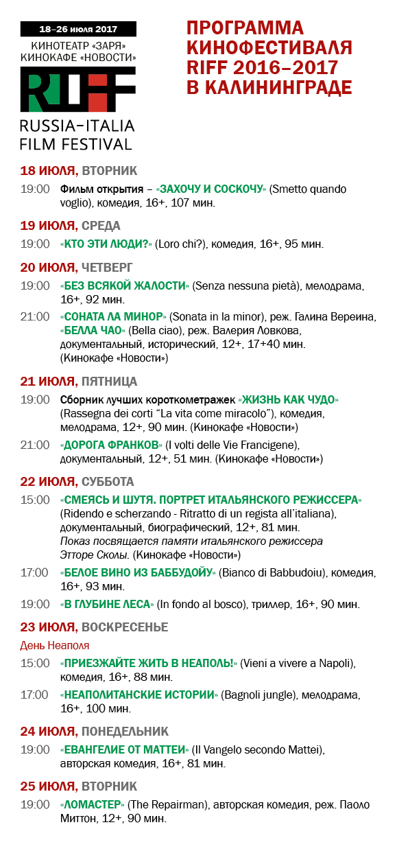 Film! Film! Film! С 18 по 25 июля в Калининграде пройдет российско-итальянский фестиваль художественного, документального и короткометражного кино RIFF. Все ленты, которые нам представят, являются победителями и участниками международных и итальянских кинофестивалей. Чтобы немного сориентировать вас в репертуаре RIFF, мы выбрали 5 наиболее интересных, на наш взгляд, фильмов, и хотим вас с ними познакомить