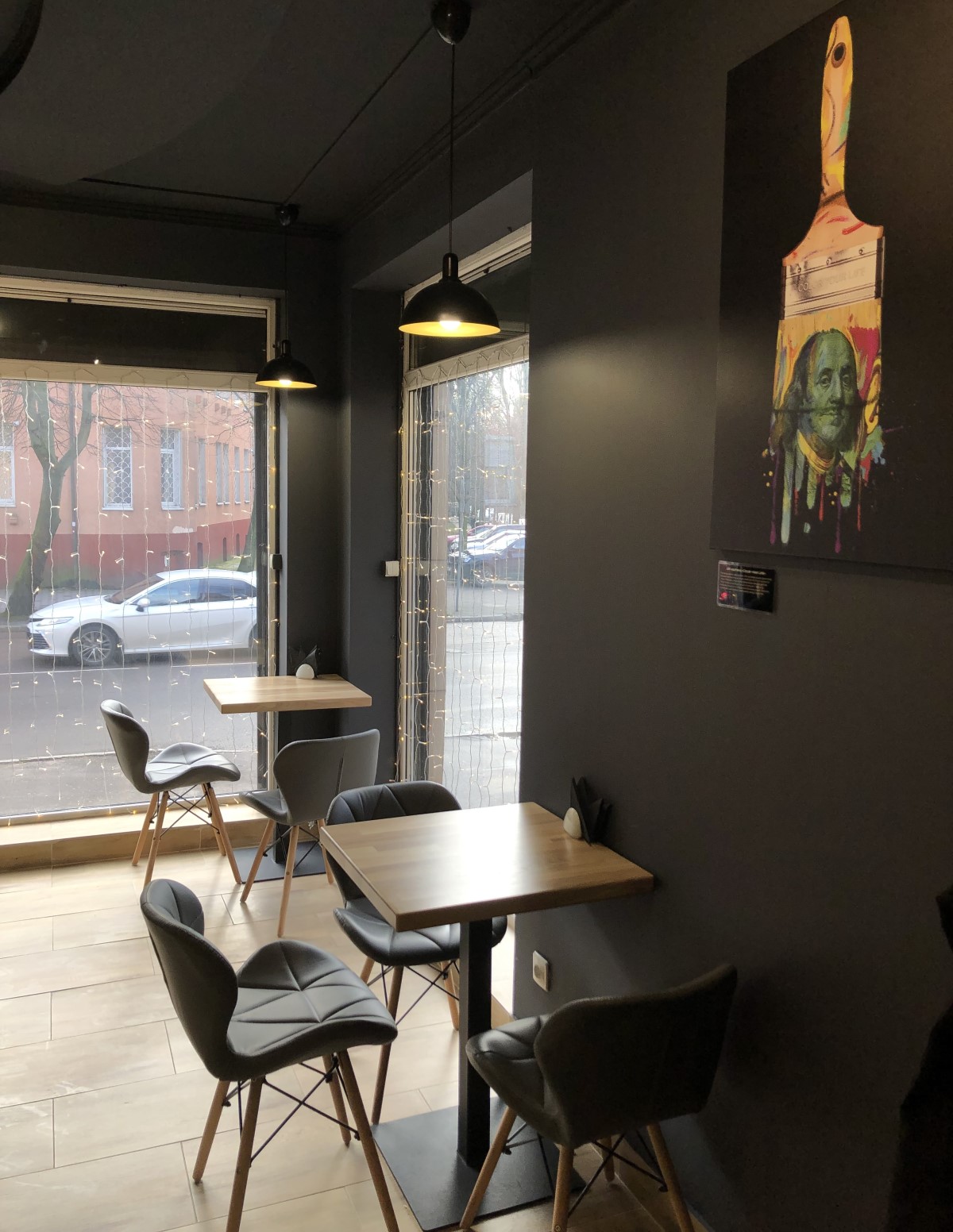 В Калининграде на ул. Карла Маркса, 38, открылась новая кофейня. Это pet-friendly* место в красивом районе пока не пользуется слишком большой популярностью, поэтому здесь можно посидеть в тишине или даже поработать за ноутбуком. Кофейное меню вполне классическое: эспрессо, капучино, авторские напитки. Ассортимент десертов ещё скучноват. Интерьер оформлен в фирменном стиле франшизы: тёмные стены, ярко-зелёные акценты и арт-картины. По задумке владельцев они должны «визуализировать желания» и «привлекать финансовое благополучие». Хотя цены на напитки и десерты и без этого вполне демократичные — самый дорогой кофе обойдётся в 200 рублей.