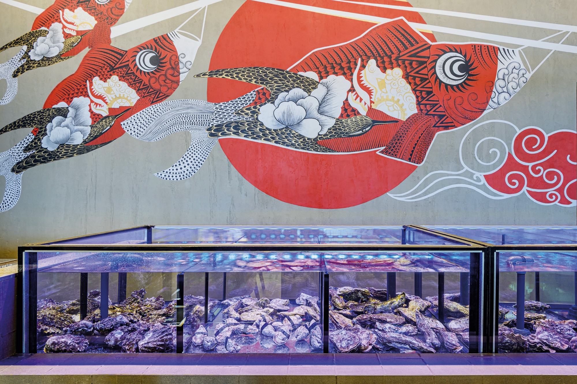 — У нас также появился уникальный Raw Bar. Здесь в аквариумах находятся живые морепродукты, среди которых — устрицы, морские ежи и гребешки. Выбор достаточно большой и разнообразный. Каждый гость может подойти, посмотреть и на чем-то остановиться, — рассказывает маркетолог заведения Анастасия Бобкова.