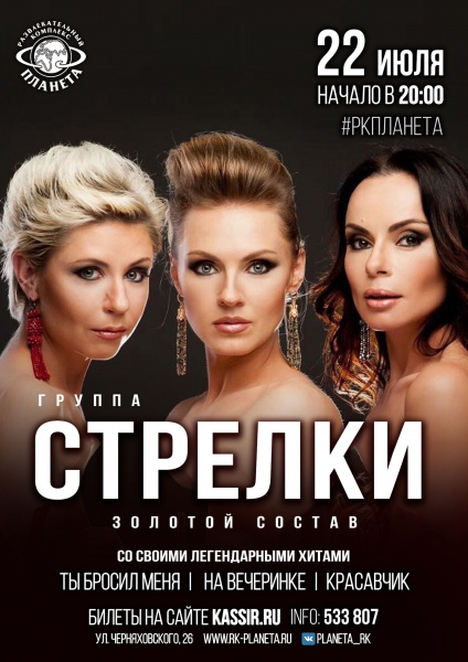 В июле в Калининград приедет популярный в 90-е и 00-е гёрлз-бэнд «Стрелки». На сцену развлекательного комплекса «Планета» выйдут Гера, Марго и Кэтт, которых принято считать золотым составом группы. Певицы исполнят хиты «На вечеринке», «Ты бросил меня», «Солнце за горой», а также новые песни.