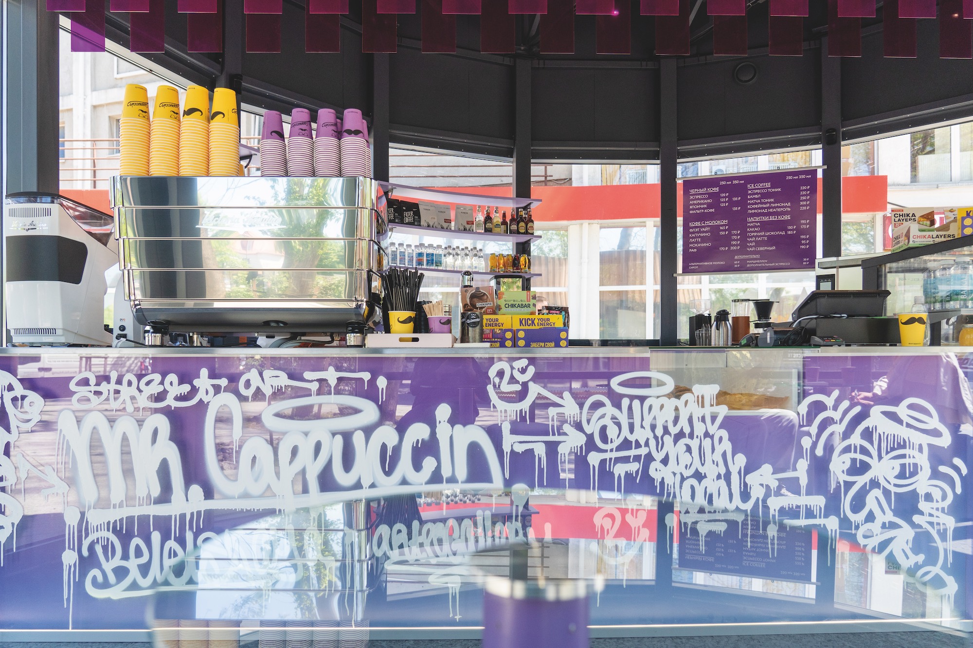 В Зеленоградске на Привокзальной площади открылась новая точка от создателей кофеен Mr. Cappuccin. Владельцы — молодая амбициозная пара, которые хотели создать такое же яркое место, как они сами. Кофейню невозможно не заметить благодаря дизайну от Дарьи Белецкой. Интерьер был вдохновлён оттенком very peri, который компания Pantone признала цветом 2022 года. Это не только следование трендам, но и напоминание о том, в каком году открылась кофейня. Граффити тоже были выбраны неслучайно: хотелось сделать отсылку к тому, каким раньше было это место, как обычно выглядят «пожившие» остановки с тегами. Графику создал калининградский стрит-арт художник ArtPo.