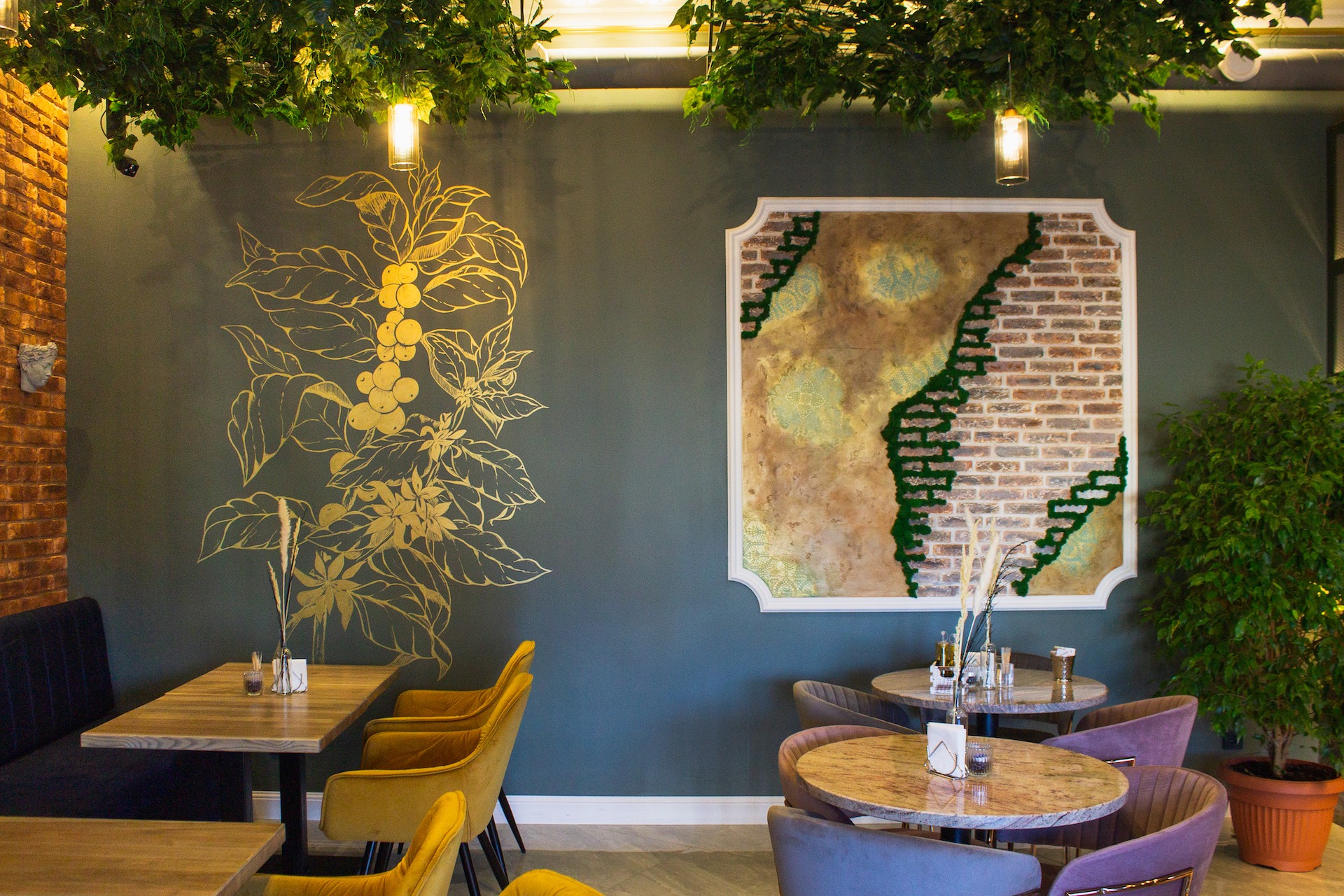 В отдалении от туристической части Светлогорска открылось небольшое кафе Nazari. Внутри симпатично: потолок декорирован зеленью, стены украшены панно и зеркалами, в центре барная стойка с аккуратной подсветкой, на столах — вазы с сухоцветами. На одной из стен золотой краской нарисована ветка кофейного дерева. Выглядит эффектно.