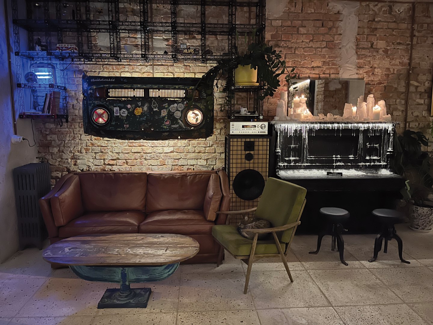 Панковский интерьер впечатляет брутальностью: барная стойка сделана из стеклоблоков, в стену вмонтирован автобусный бампер, мигающий фарами, а пианино, залитое свечным воском, используется как столик. Дополняют атмосферу хулиганские надписи на стенах и таблички «Стол наказан». А изюминку заведению добавляет постоянный посетитель — кот Матроскин. Он гуляет сам по себе, но всегда возвращается в бар, где явно чувствует себя хозяином. Кстати, у кота есть собственный аккаунт в соцсетях, где регулярно появляются репосты историй от многочисленных поклонников.
