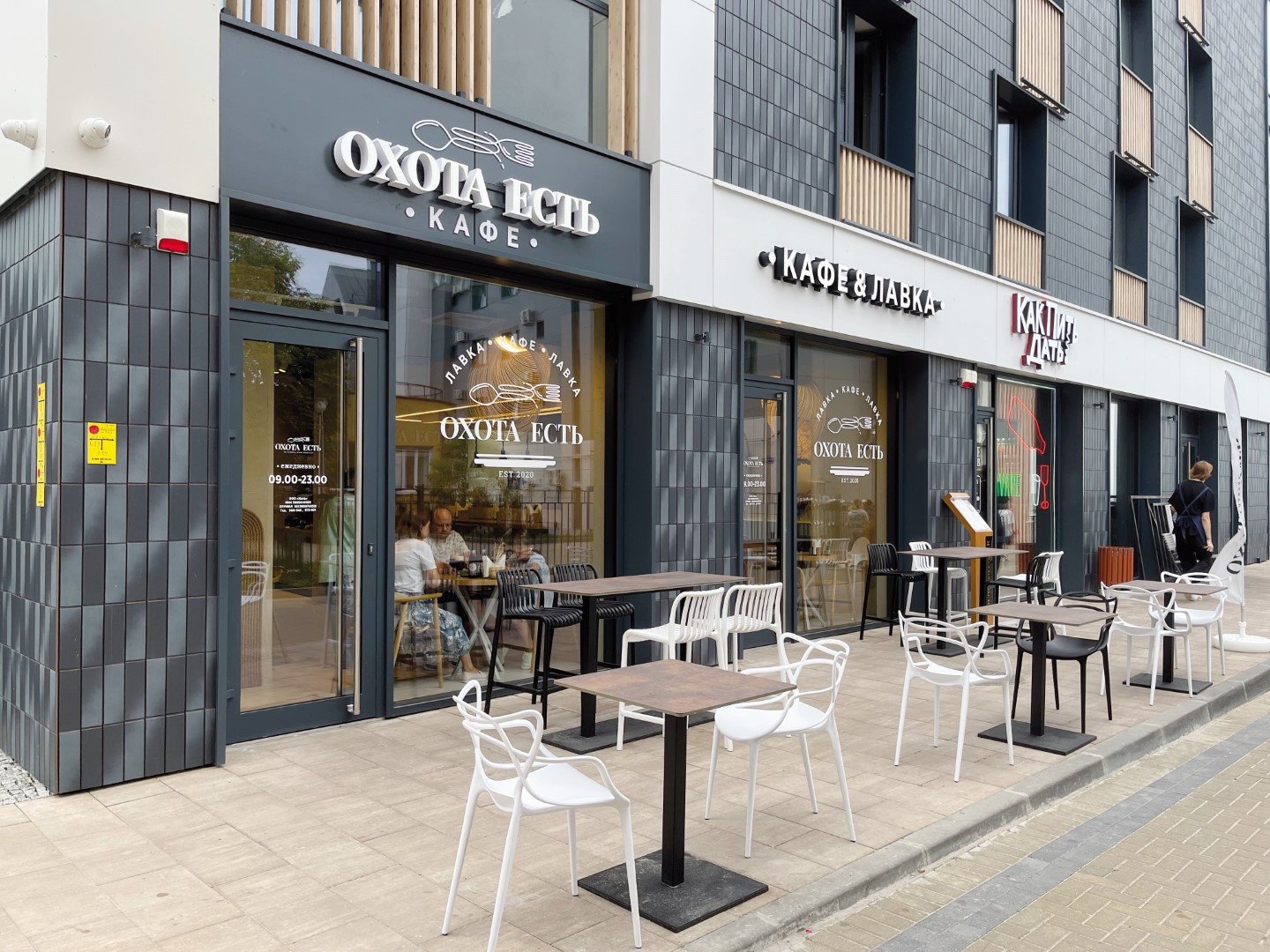 Сеть кулинарных лавок «Охота есть», где продают замороженные полуфабрикаты собственного производства, запустила новый формат, сочетающий магазин и кафе. Первое такое заведение открылось в Калининграде этой весной, а в разгар туристического сезона появилось и в Зеленоградске. Можно перекусить на террасе с видом на море или в уютном интерьере кафе. Есть отдельный раздел завтраков, а в основное меню включили салаты и супы, неплохие горячие блюда и пару видов пасты.