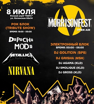 Стартует большой музыкальный фестиваль рок- и электронной музыки от Morrison. Главный резидент бара откроет мероприятие и заставит вас отжигать под лучшие рок-боевики. Зрителей ждут NIRVANA Tribute Show в исполнении главной гранж-группы Калининграда INFECTION’s, METALLICA Tribute Show в исполнении Y.band, DEPECHE MODE Tribute Show в исполнении главных неоромантиков Калининграда «ЛондонParis». Электронный блок представят DJ GOLITCIN из Санкт-Петербурга, DJ GRISHA из Москвы, а также калининградские Dj Agama, Dj Smolique и Dj Gross.