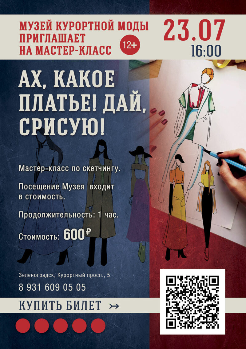 В стенах модного пространства Зеленоградска состоится тематический мастер-класс по скетчингу. Скетчинг — это зарисовка, набросок или эскиз. Участники перенесут наряды с музейной витрины на свои картины и смогут почувствовать себя одновременно художником и модельером. Никаких талантов не требуется, с собой необходимо иметь только желание творить и отличное настроение. Все материалы и посещение музея входят в стоимость.