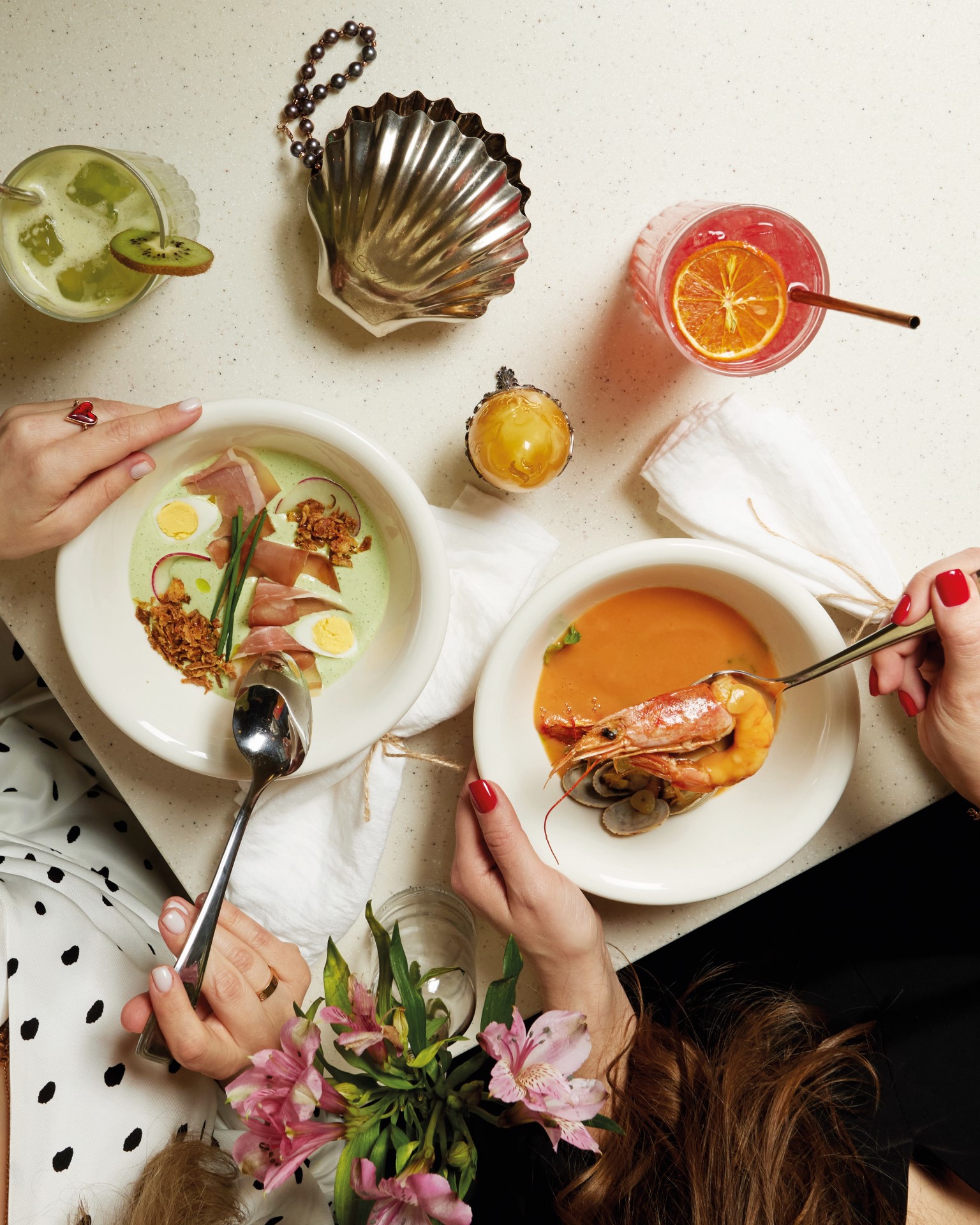 Новый «Марсианин» — это уже нечто большее, чем просто кофейня. В меню есть закуски, салаты, супы и горячие блюда. Ассортимент небольшой, но есть из чего выбрать. С 9:00 до 12:00 подают завтраки, а на витрине всегда свежие десерты: торты, профитроли, трюфели и булочки. Ну а кофе здесь всё так же хорош — как и на Пролетарской, его готовят на спешелти-зерне от российских обжарщиков. Кстати, зёрна, дрип-пакеты и китайский чай можно приобрести домой.