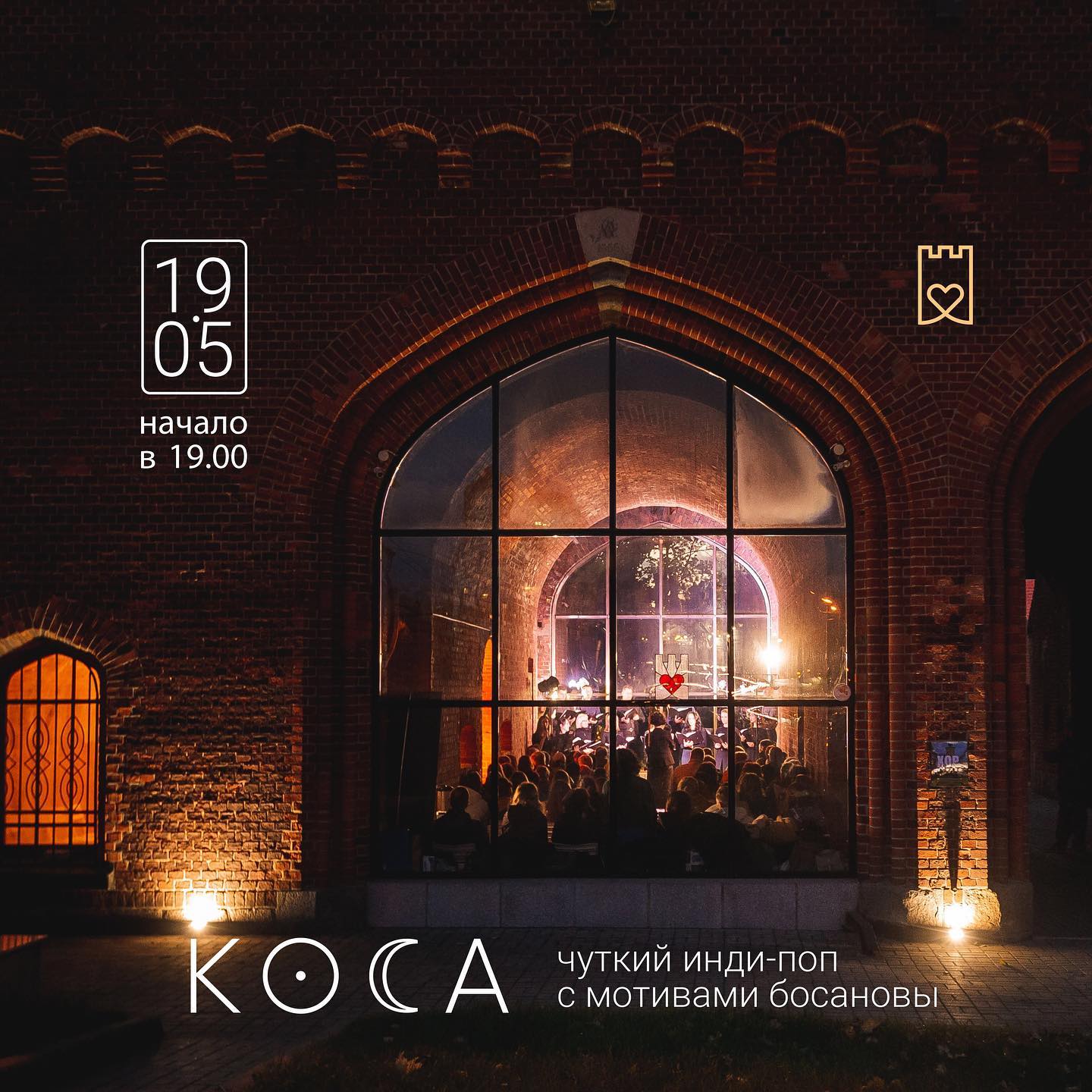 Калининградский коллектив «Коса» исполняет мелодичный и чувственный инди-поп с налётом босановы. Несмотря на регулярные перемены в составе, вместе с которыми меняется и набор инструментов, группе каждый раз удаётся найти собственное, не похожее на других звучание. К выступлению в живописной штаб-квартире движения «Хранители руин» квартет подходит в форме, наиболее подходящей для этой площадки. Полуакустическое, интимное звучание «Косы» обретёт дополнительную глубину за счёт естественной реверберации Железнодорожных ворот.