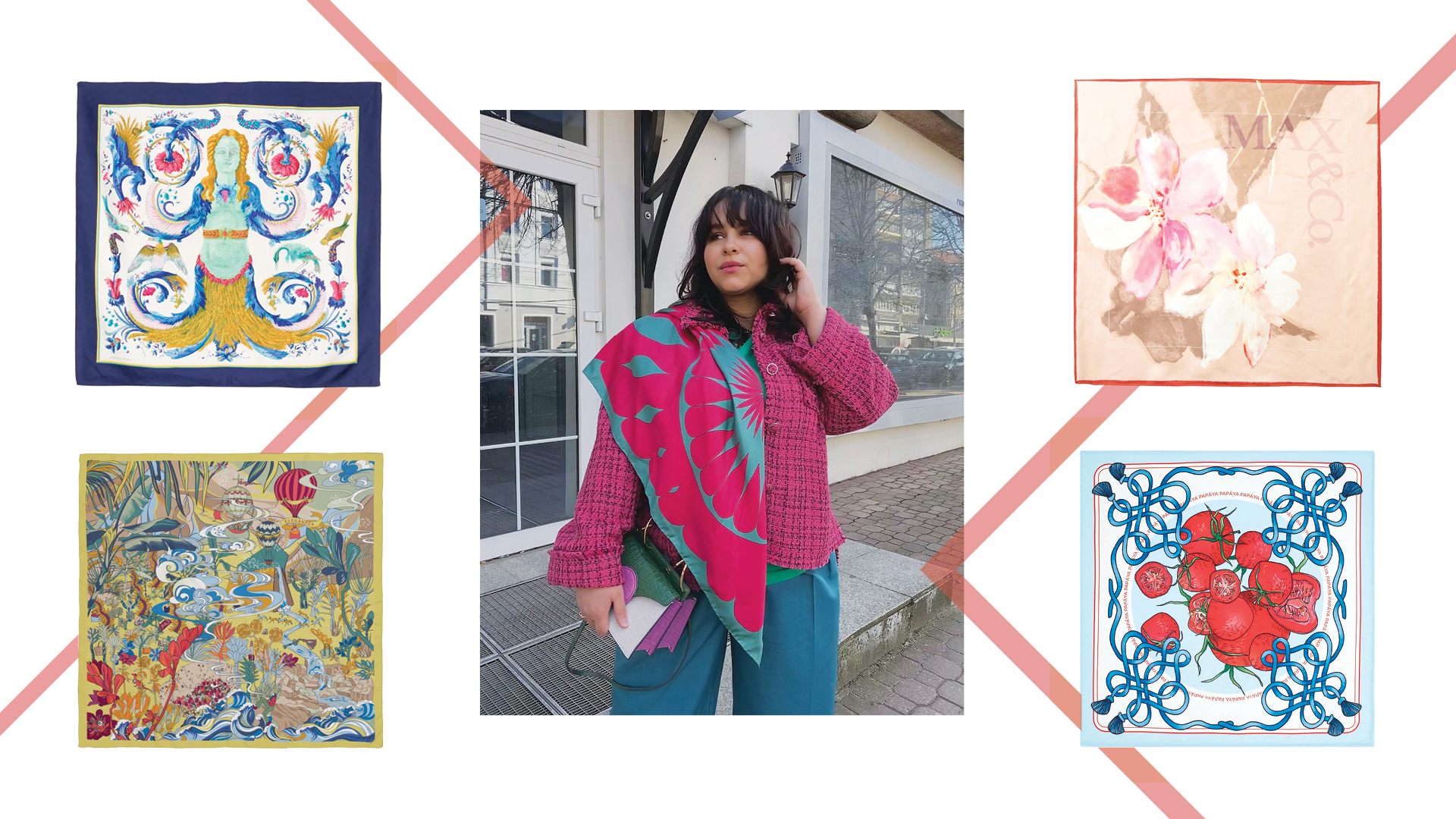 Лично я в этом сезоне обзавелась тремя фаворитами: платок нежно-зелёного оттенка с жёлто-розовыми цветами, лаконичный чёрно-белый с графичным принтом и мини-вариант на запястье в морском стиле. Их всегда можно взять с собой, уложив в сумку, и трансформировать образ в течение дня.