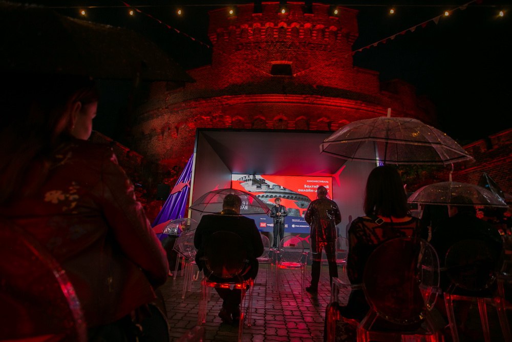 Погода начала портиться, гости раскрывали зонты: их на случай дождя предусмотрительно оставили в специальной корзине. К приглашённым присоединился губернатор Антон Алиханов с жёлтым рюкзаком за спиной. Дождь усилился, и министр по культуре и туризму Андрей Ермак надел прозрачный дождевик. Позднее со сцены он заявил, что фестиваль, скорее всего, повторят в онлайн-формате и в следующем году. О том, что Калининград стал первопроходцем в проведении такого фестиваля, сказал и генеральный продюсер сервиса ivi Давид Кочаров.