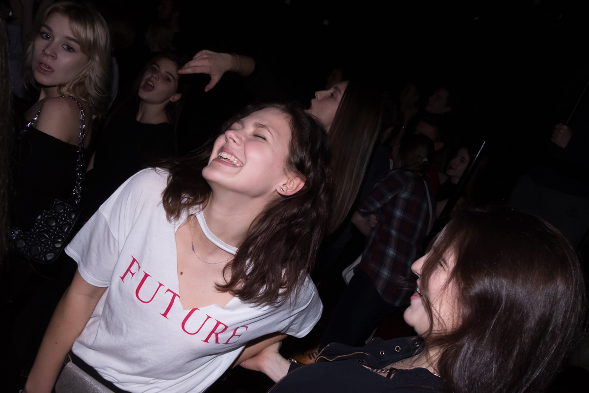 Пока идёт разогрев Фараона, девчонки и мальчишки, а также их родители подходят к Андрею Левченко, который ходит по «Вагонке» со слегка паникующим выражением лица, скорее всего из-за слабого знакомства с тенденциями русской рэп-музыки, и спрашивают про возможность сфотографироваться со звездой. Тот ничего не обещает, но кивает. В конце вечера он найдет каждого подошедшего и организует селфи-фотосессию с хедлайнером, но это потом. А когда на сцену выйдет Фара, в пору зажать уши двумя пальцами – женский визг, кажется, слышно даже в сегменте частных бань у мотеля «Балтика». Фараон прекрасно знает, что девушки его любят. Он обыгрывает это в общении с залом, выдавая «Поднимите руку, кто пришёл без девушки на концерт» (поднимется рук десять), «А сейчас о разбитых сердцах и прочей … (фигне)». Ослепительная красавица рядом цепляется когтями за коротко стриженого спутника лет на 10 старше её и почти кричит: «Ну почему тебе он не нравится?»