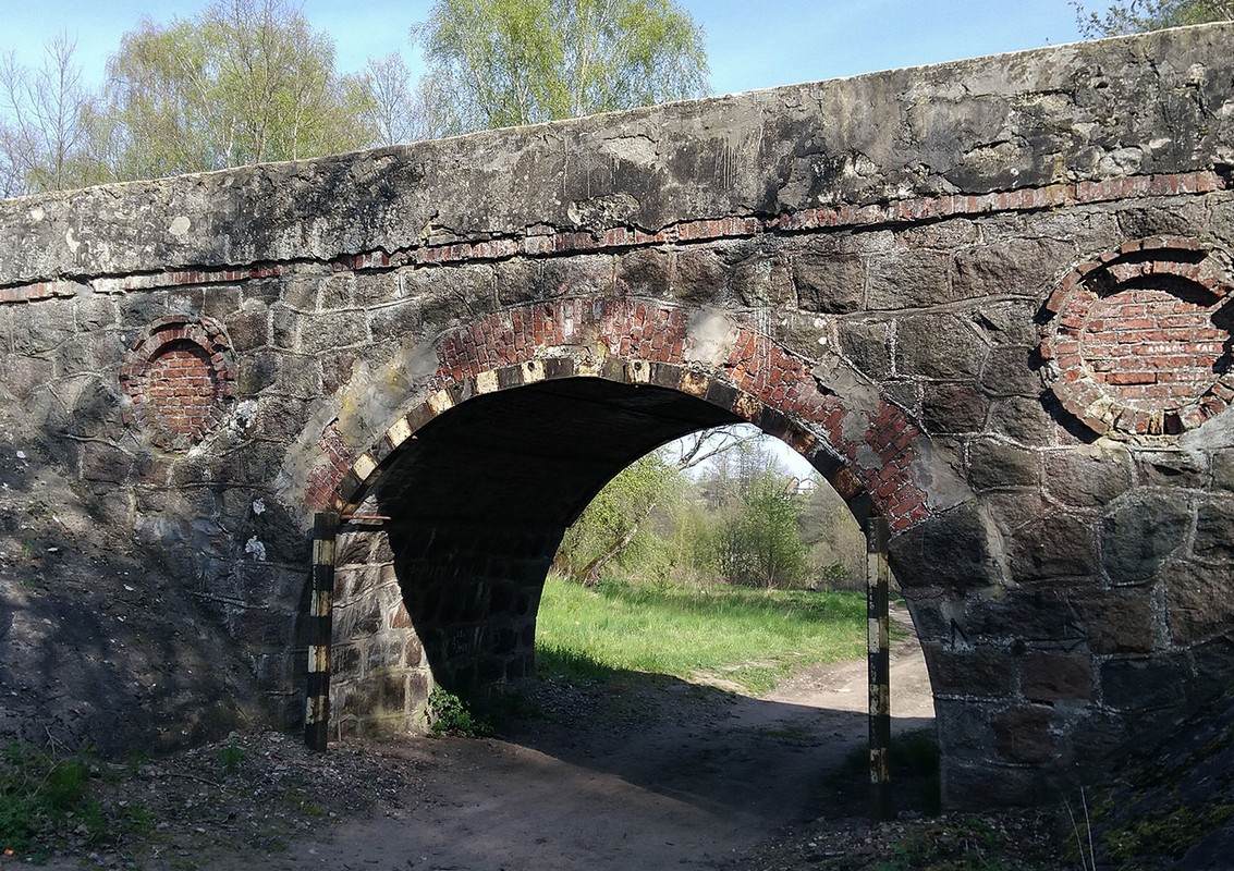 Недалеко от Камня лжи, если пройти дальше вдоль реки, а затем подняться на грунтовую дорогу, есть старинный железнодорожный мост. Он почти идеально сохранился, кроме барельефов, от которых на опорах остались зияющие пустоты.