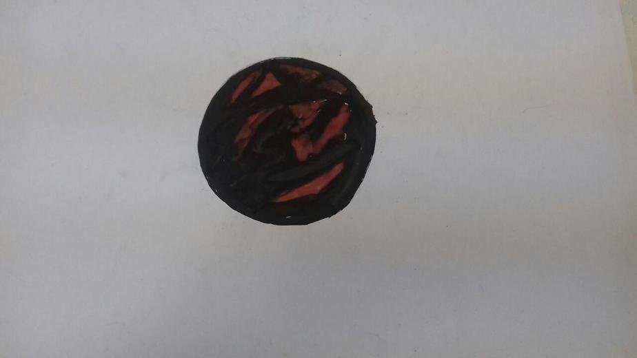 К своей работе молодой человек вернулся через месяц лечения. На чёрном круге появились красные пятна и линии. «Это извилины моего мозга», — пояснил автор.