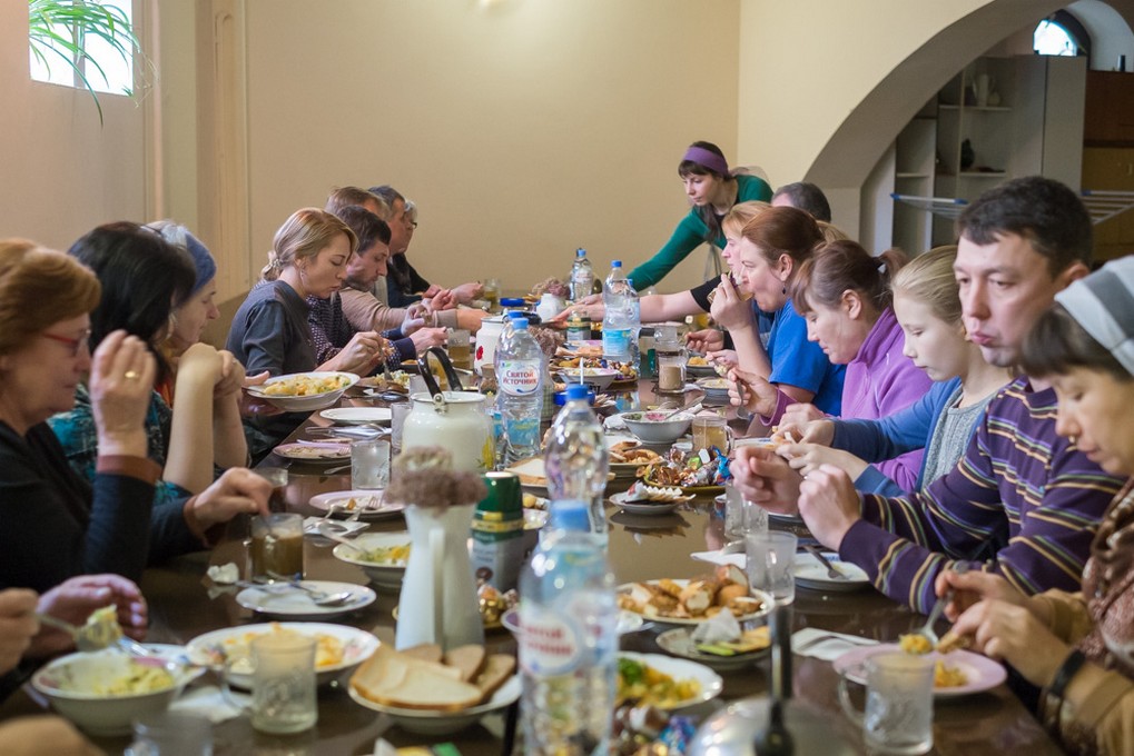 Чтобы узнать про кулинарные традиции баптистов, мы отправились в церковь Мира на Гагарина, 18, где нас встретил сам пастор Анатолий Иванович Крикун. Он подробно рассказал обо всех особенностях протестантской церкви, обычаях, праздниках, представил общине и тоже пригласил на обед – за длинный-длинный стол, за которым сидели и церковнослужители, и прихожане. Обед начался с благодарственной молитвы, а закончился пением известного христианского гимна «Великий Бог».