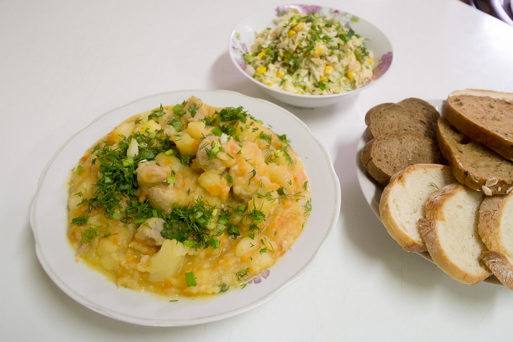 Еда у нас простая. Первые блюда – борщ или рассольник. Второе – может быть плов, потому что его проще приготовить на большое количество людей, или что-нибудь из картофеля, из риса, гречки. Курица. Молочные продукты тоже употребляем.