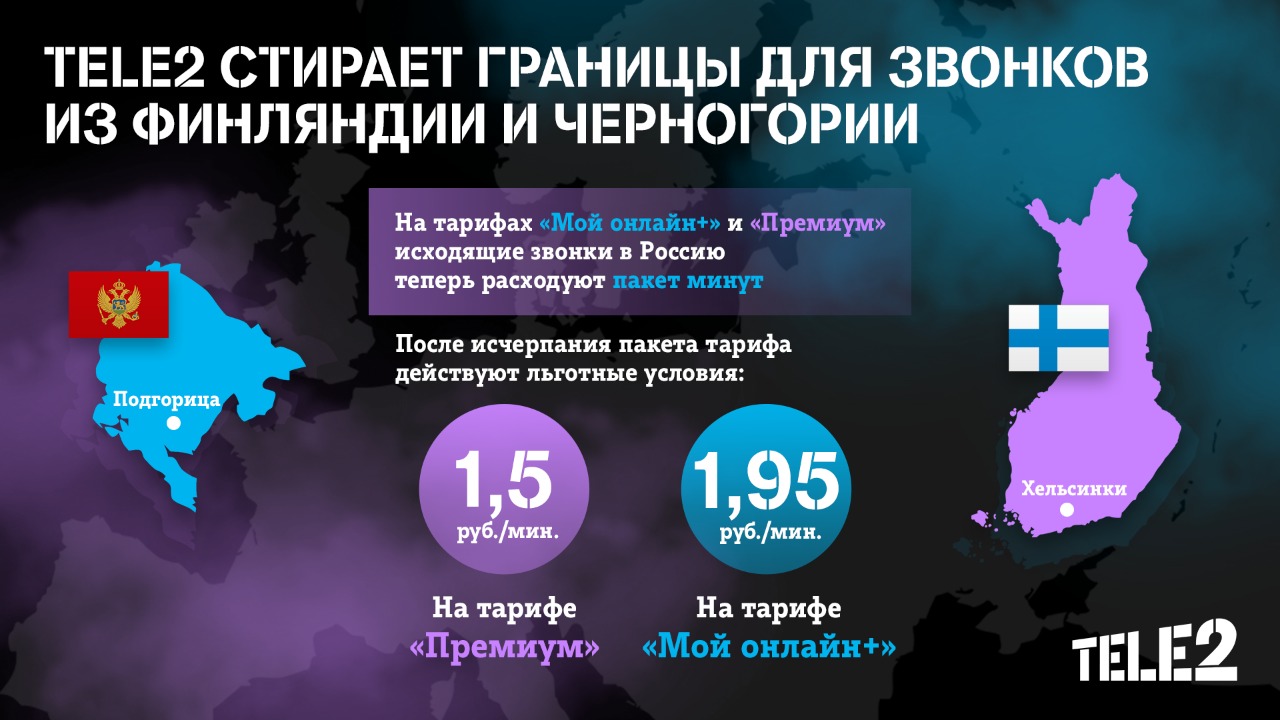 Мобильный оператор Tele2 подготовил специальное предложение для пользователей тарифных планов «Мой онлайн+» и «Премиум». У абонентов этих тарифов из всех регионов в путешествии по Финляндии и Черногории исходящие звонки в Россию будут стоить, как дома