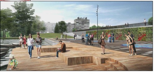 Реконструкция подпорной стенки, организация видовой площадки у воды с деревянными помостами для отдыха и многочисленных селфи.