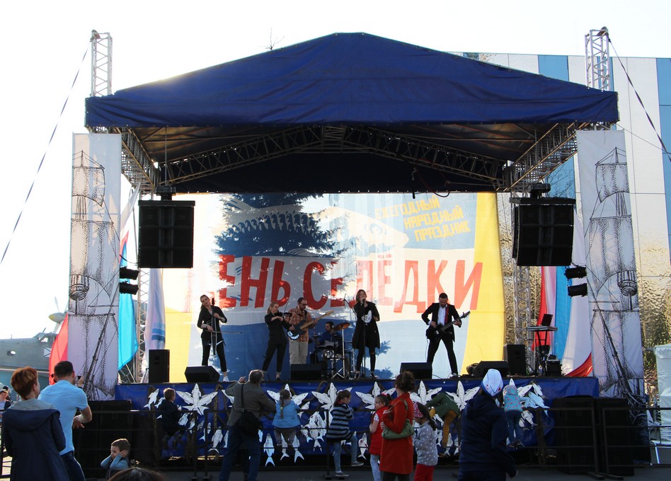 Выходные в Музее Мирового океана выдались жаркими и неугомонными на выступления различных коллективов. Празднество в честь самой распространённой у нас наравне с корюшкой рыбой – селёдкой – выглядело не особо презентабельно. Заходя на территорию музея, сперва натыкаешься взглядом на замусоренные столы, пару охранников, толпу Россгвардии и вальяжно греющихся на солнышке собаку.