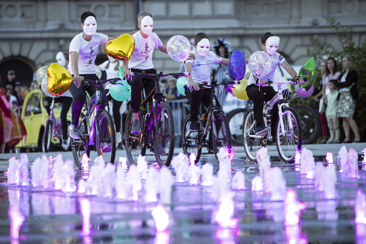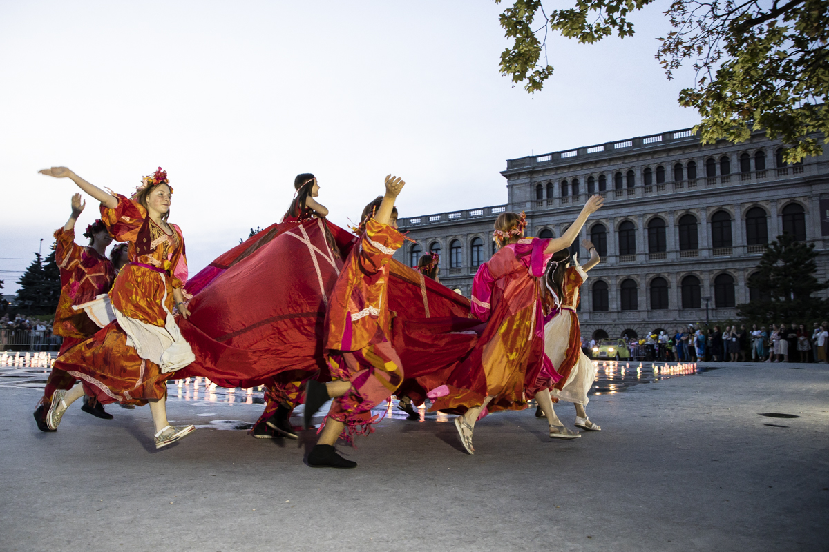 Люди на Эстакадном мосту, люди на ступенях ДКМ, люди между голубых елей — конечно, сквер — не сценическая площадка, и это одновременно и плюс, и минус. В этот вечер ей суждено было стать мистическим театром. После долгих часов репетиций художественный руководитель фестиваля Алла Татарикова-Карпенко собрала команду из 90 человек, лишь немногие из которых являются профессиональными артистами. В фантастических нарядах, на велосипедах, самокатах, роликах, ретро-автомобилях они выходили и выкатывались на площадь, огибая светящийся фонтан или заныривая прямо в него.