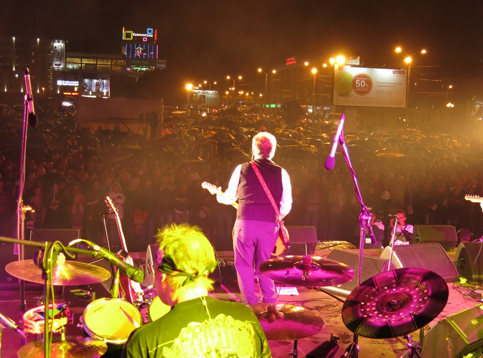 Хотя сами музыканты, похоже, были рады. Новик даже выложил селфи на фоне Дома Советов и мокрой брусчатки. Ну и гитарист «Billy's Band» зажигал – маленький кудрявый «Рыжик» прыгал, будто в кедах у него пружины. Молодцы, конечно. Были и «Оторвемся по-питерски» и «Питер!Питер!Питер!», она же «Терпи! Терпи! Терпи!». К выступлению «Чайфов» зрителей стало вдвое больше, и пробраться к сцене было уже нереально. Там, в первых рядах, места заняли влюбленные парочки и папы с детьми. Шахрин порадовал всех белыми лакированными туфлями, а второй Владимир – Бегунов, гитарист группы, - появился в образе мушкетера. Усы и бородку он отпустил потрясные. Еще перед концертом Владимир Шахрин сказал, что на уличные концерты приходят люди случайные.