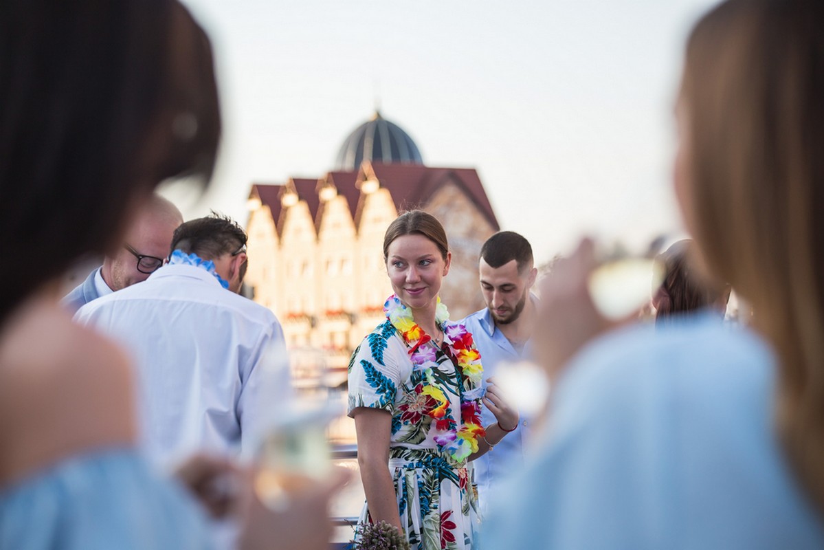 В этом году ежегодное летнее мероприятие отеля Radisson, которое проводится в знак благодарности постоянным клиентам, прошло на теплоходе «Самбия». Тропическая тематика вечеринки выбрана неспроста – не будем раскрывать подробностей, лишь тезисно обрисуем вам некоторые детали пока ещё далёкого будущего в стенах отеля: лето посреди декабря, атмосфера жарких стран, all inclusive...