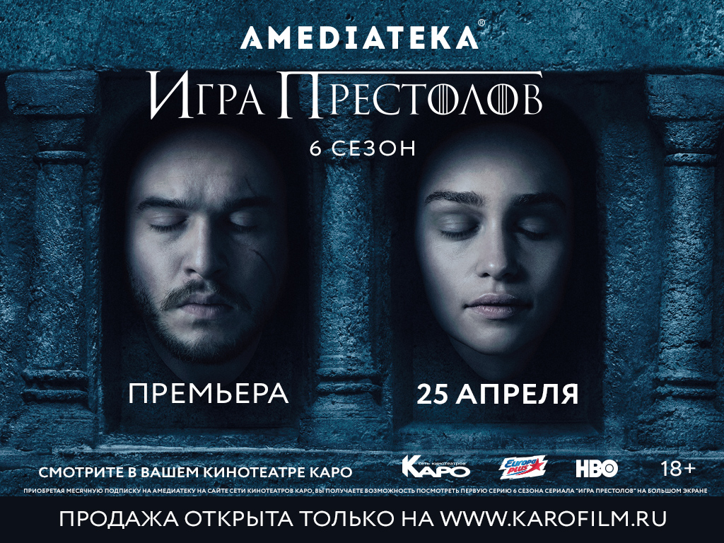 Только в один день, 25 апреля, в 20.00, одновременно со всем миром, онлайн-сервис Амедиатека представит долгожданную премьеру шестого сезона культовой фэнтези-саги «Игра престолов» в сети кинотеатров нового поколения «КАРО» в Москве, Санкт-Петербурге, Екатеринбурге, Сургуте, Калининграде, Самаре и Казани.