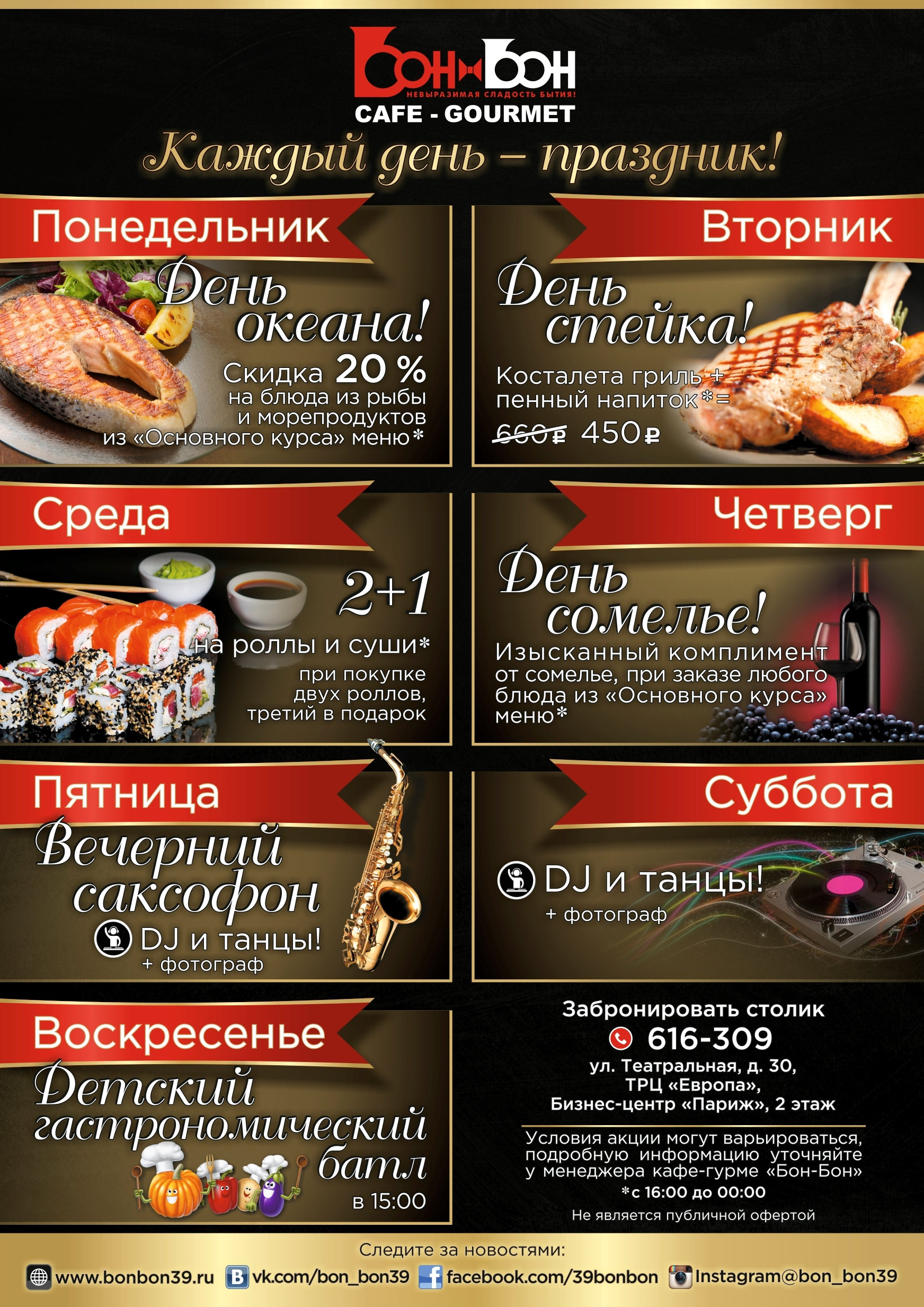 Хорошая новость для любителей вкусных блюд и разнообразия: в «Бон-Боне» стартует караван ежедневных акций, который превратит эту осень в праздник и на каждый день создаст яркий повод посетить заведение
