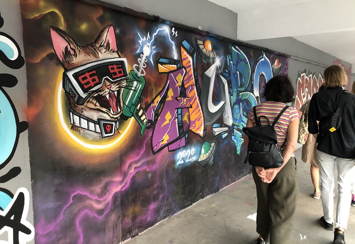 Следующий пункт — старые калининградские граффити на Фестивальной аллее. Самое давнее из них датируется 1998 годом, его автор — знаменитый Макс Навигатор, один из пионеров стрит-арта в городе. Хотя стену, на которой оно нарисовано, не раз ремонтировали и красили, само граффити до сих пор остаётся нетронутым.