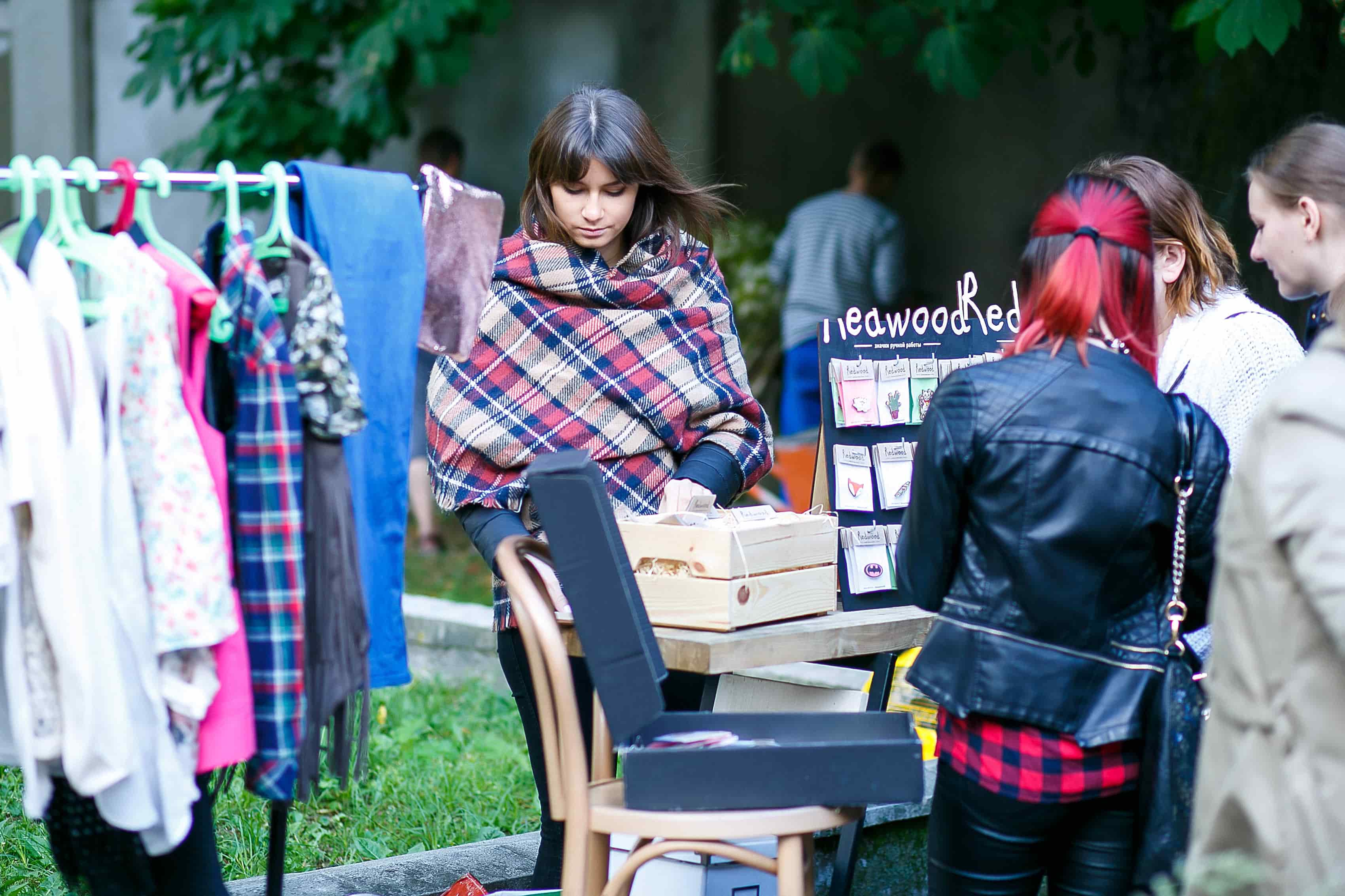 Главное, зачем стоит прийти, - найти то самое единственное платье, привезённое из Парижа. Кроме этого - за ретро-рубашками Ralph Lauren, сумками noname с надписями, например, drama, или ультрамодными вещами с бахромой и клешами. Среди несметного количества блестящих аксессуаров можно было обнаружить смешные деревянные значки Redwood, уже знакомые нам со многих городских маркетов. Или же аксессуары калининградской марки InThePines и магазина отечественных брендов Rave store по приятной цене.