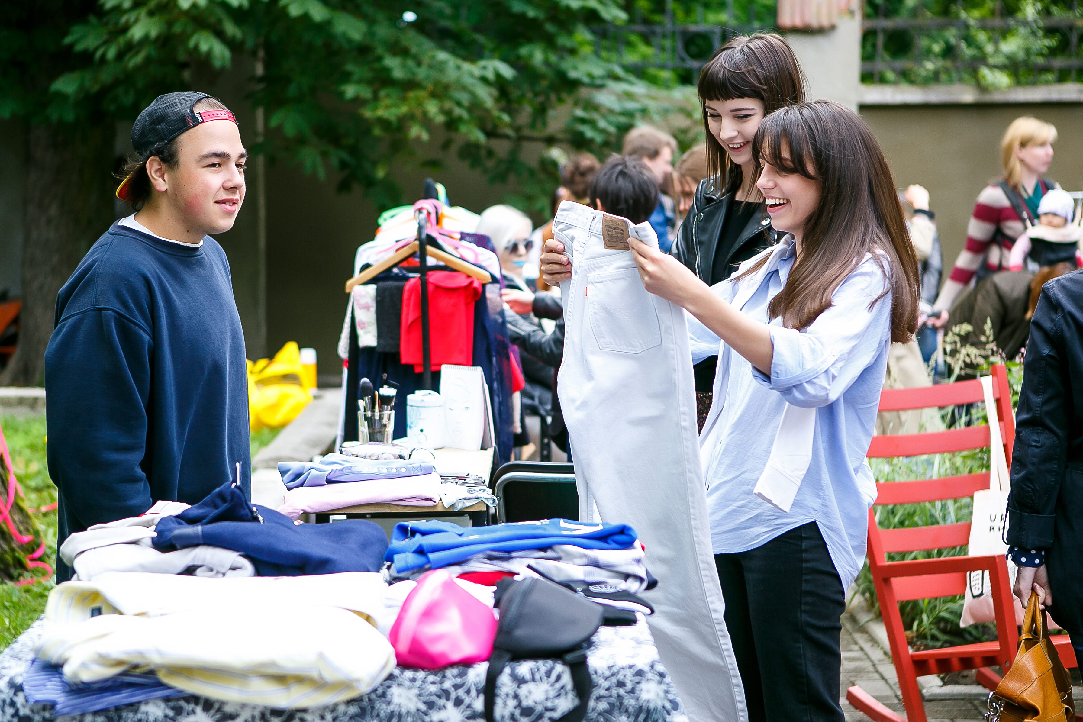 На ветках деревьев, в лучших традициях московских дизайн-маркетов, висели салатовые цветы из бумаги, играла музыка, а каждый продавец рассказывал тебе истории - о контрафактных рамочках, неизвестном дизайнере, материалах, тканях, фасонах, и том, как эти вещи появились у него. Приходить на барахолку нужно не только ради покупок, общение и новые знакомства - самое ценное приобретение.