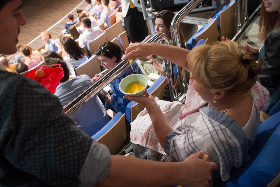 Во многом это произошло благодаря интенсивной обратной связи со зрителем - уже в разогреве шоу, пока гости рассаживались по местам, а свет в зале еще не был выключен, актеры играли со зрителями - приглашали их принять участие в приготовлении блюд, перебрасывались лимонами и куриными яйцами. В процессе спектакля несколько раз зрителей вызывали на сцену, чтобы они стали частью шоу и одними из авторов фирменных блюд театральной труппы - пасты и бананового кекса, которые в финале, разумеется, были съедены - детьми в первую очередь. Но только после того как «7 пальцев» проводили, аплодируя стоя.